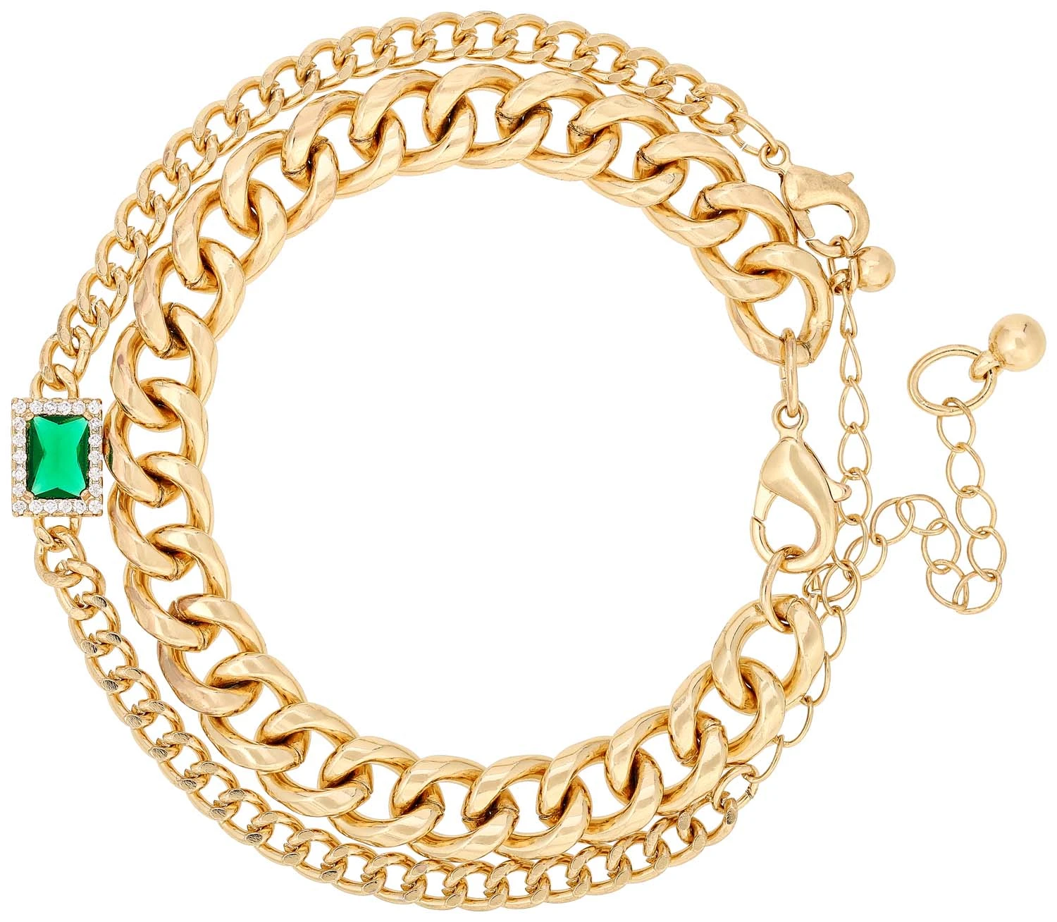 Das Arm-Set – Timeless Duo schimmert goldfarben und besteht aus zwei ArmbĂ€ndern in unterschiedlichen Designs. Ein Armband ist mit Cubic Zirkonia Steinen verziert, welche teilweise grĂŒn sind. Das andere Armband besteht aus einer Panzerkette.