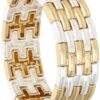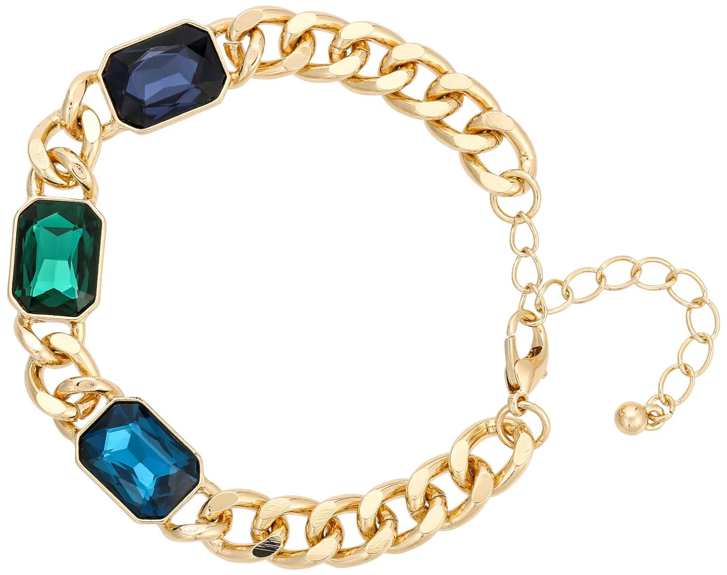 Das Armband – Chunky Strass glĂ€nzt goldfarben und ist mit drei rechteckigen Strassteinen verziert die in den farben grĂŒn und blau funkeln. Das Armband ist ein Gliederarmband und hat eine VerlĂ€ngerungskette.