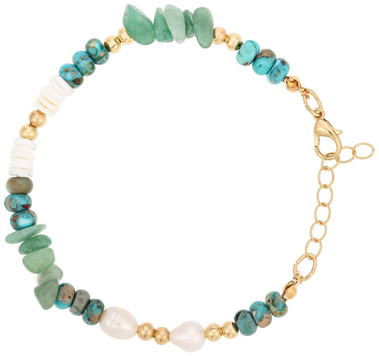 Das Armband – Green Aventurine besteht aus den echten Edelsteinen Aventurin und Magnesit. Die Edelsteine haben verschiedene GrĂŒntöne und zwischen ihnen sind SĂŒĂwasserzuchtperlen und Muscheln. Das Armband hat eine VerlĂ€ngerungskette.