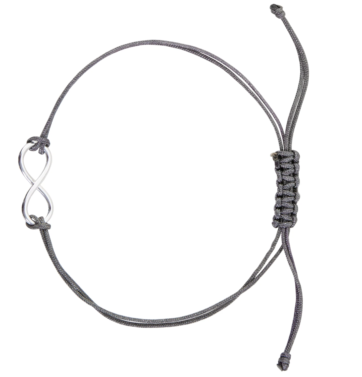 Material: Graues Textilarmband mit einem „Infinity“-Zeichen aus 925er Silber sowie einem chinesischen Verschluss.