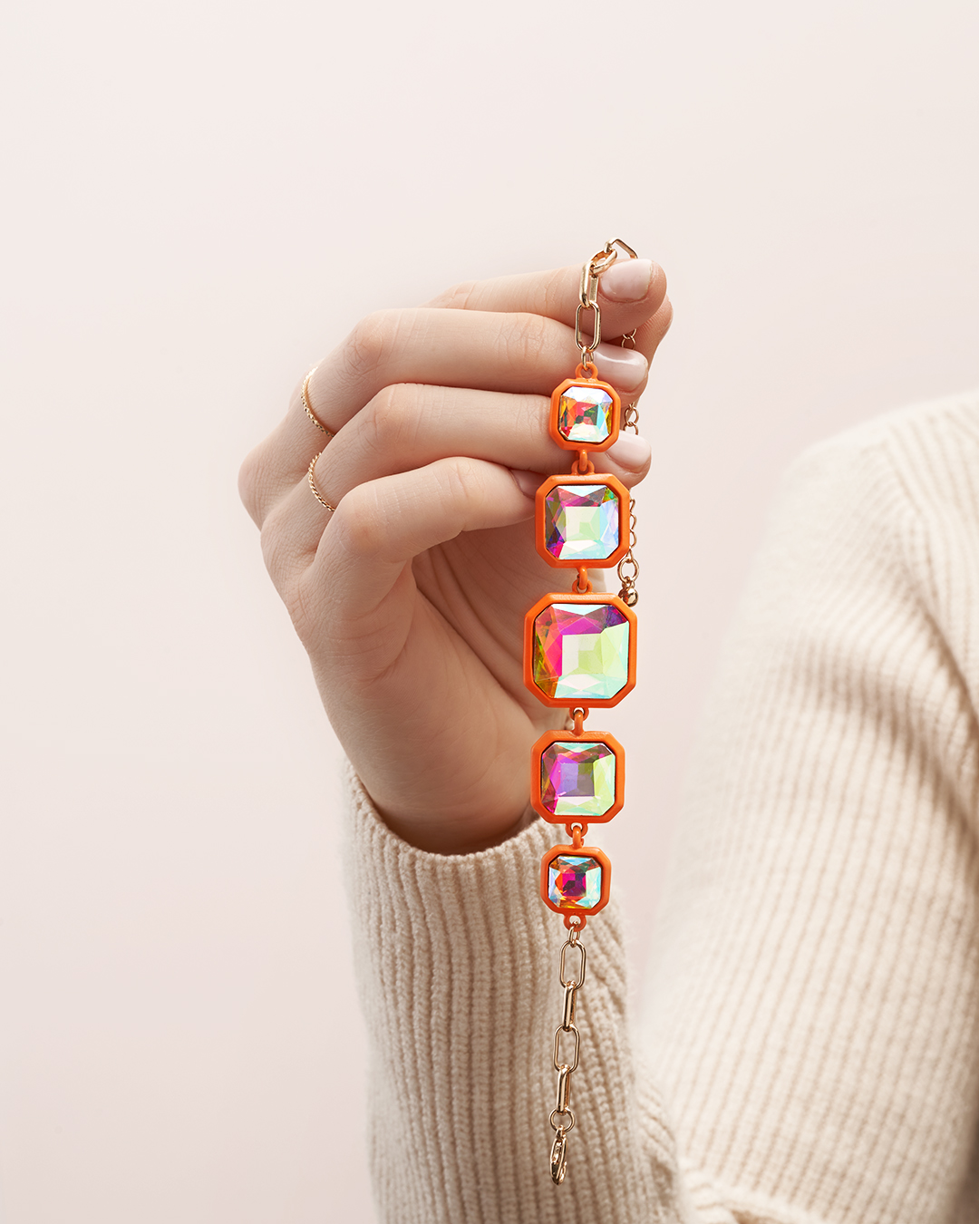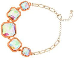 Das Armband – Mango Starlight besteht zur Hälfte aus goldfarbener Gliederkette und zur Hälfte aus orangefarbenen Quadraten die mit holographisch schimmernden Strasssteinen verziert sind. Das Armband hat eine Verlängerungskette.