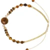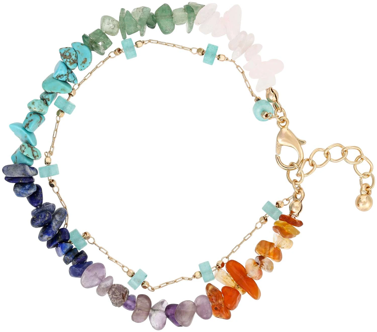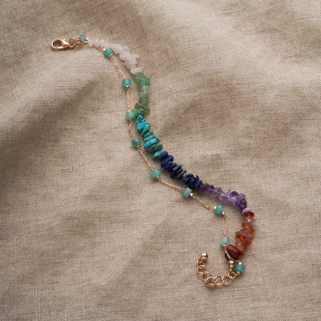 Das Armband – Natural Beauty glänzt goldfarben und ist mit einem Mix verschiedener Edelsteine verziert. Das Armband hat eine Verlängerungskette.