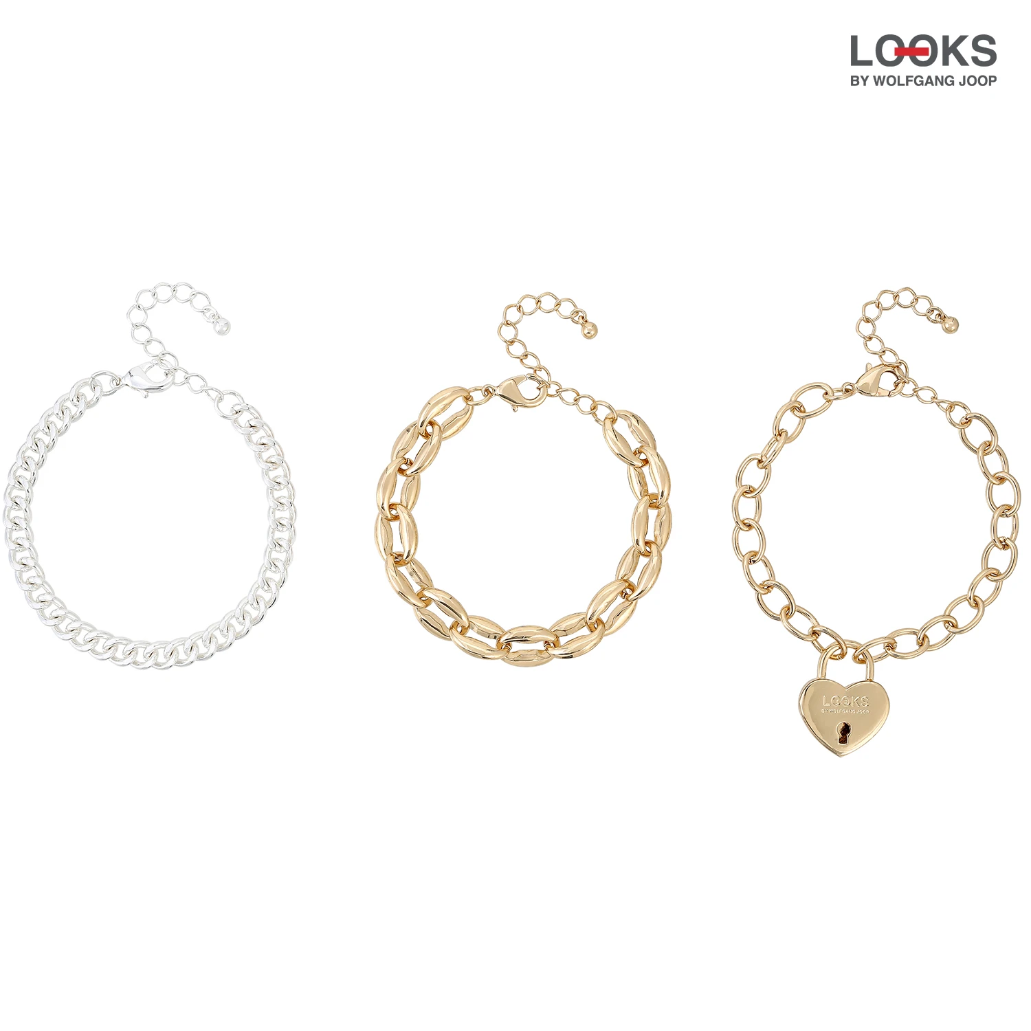 Das Armband-Set – Big Heart besteht aus drei ArmbĂ€ndern, zwei in goldfarben und eins in silberfarben. Ein Armband ist mit einem AnhĂ€nger in der Form eines Herzen verziert.