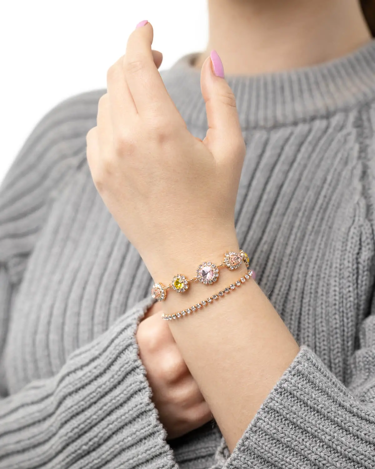 Das Armband-Set – Charming Sparkle ist goldfarben und besteht aus zwei Armbändern. Ein Armband ist komplett mit kleinen Strasssteinen besetzt. Das andere ist ebenfalls mit kleinen Strasssteinen verziert. zusätzlich schmĂĽcken aber noch größere Strasssteine in Blumen- und Tropfenform das Armband. Die Armbänder besitzen eine Verlängerungskette.