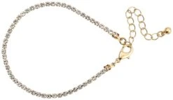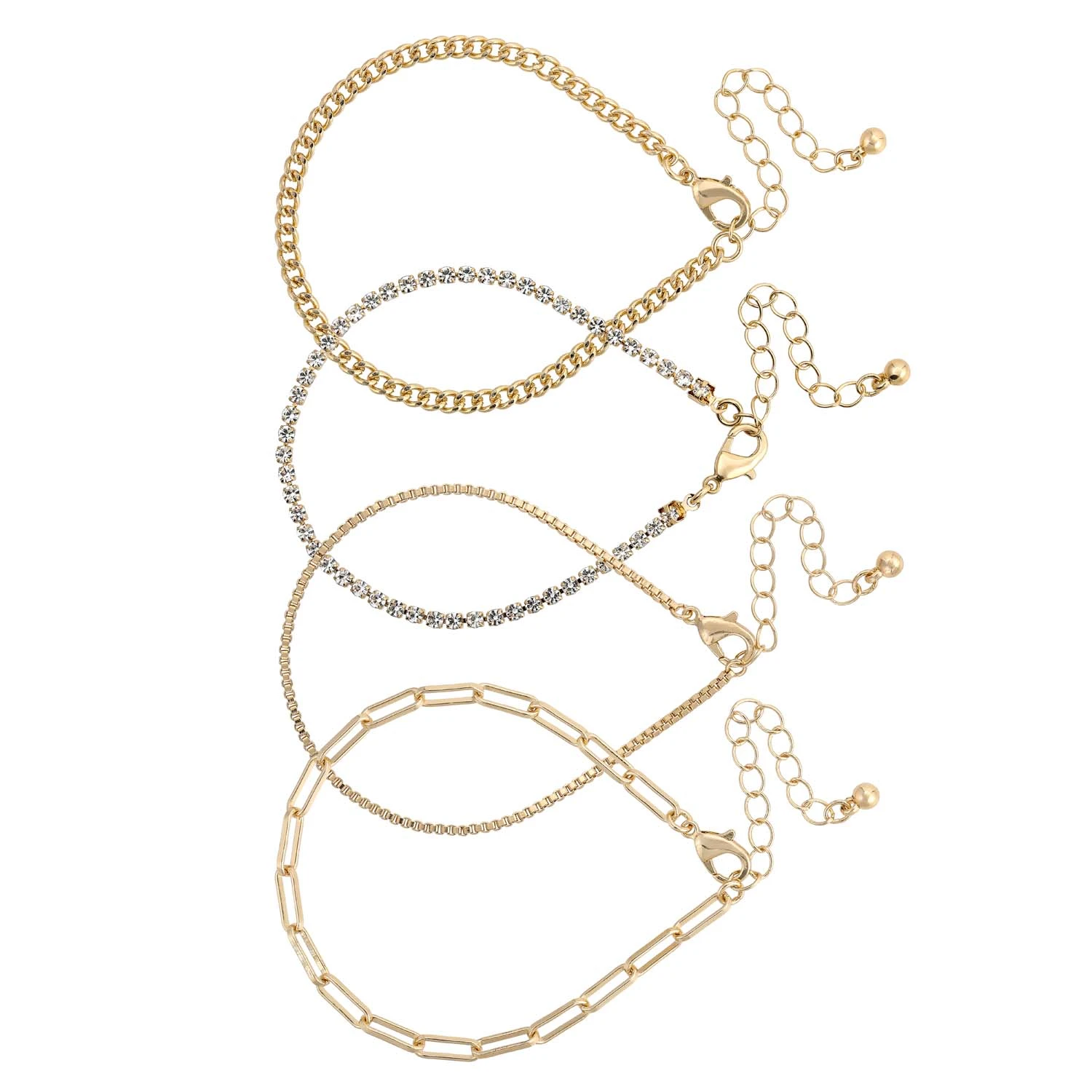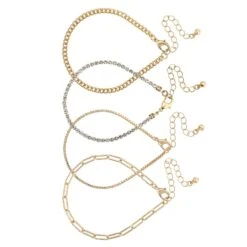 Das Armband-Set – Golden Classic schimmert silberfarben und besteht aus vier Armbändern in unterschiedlichen Designs. Ein Armband ist mit vielen, kleinen Strasssteinen verziert. Ein anderes Armband ist ein Gliederarmband. Alle Armbänder haben eine Verlängerungskette.