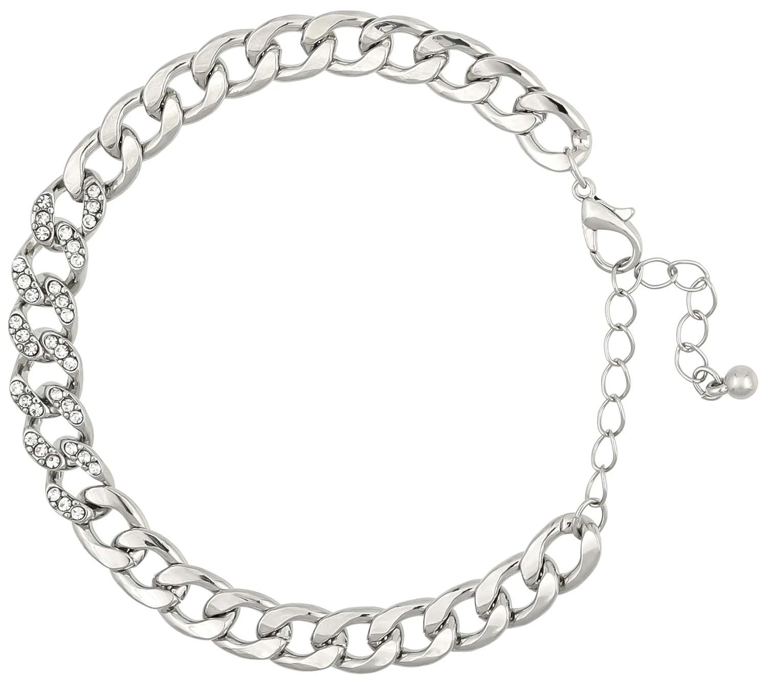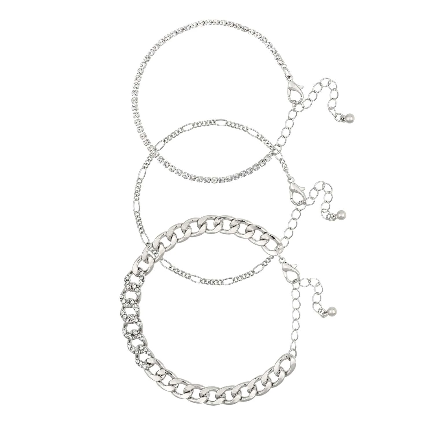Das Armband-Set – Pretty Trio schimmert silberfarben und besteht aus drei Armbändern in verschiedenen Designs. Die Armbänder sind rhodiniert und teilweise mit Strasssteinen verziert.