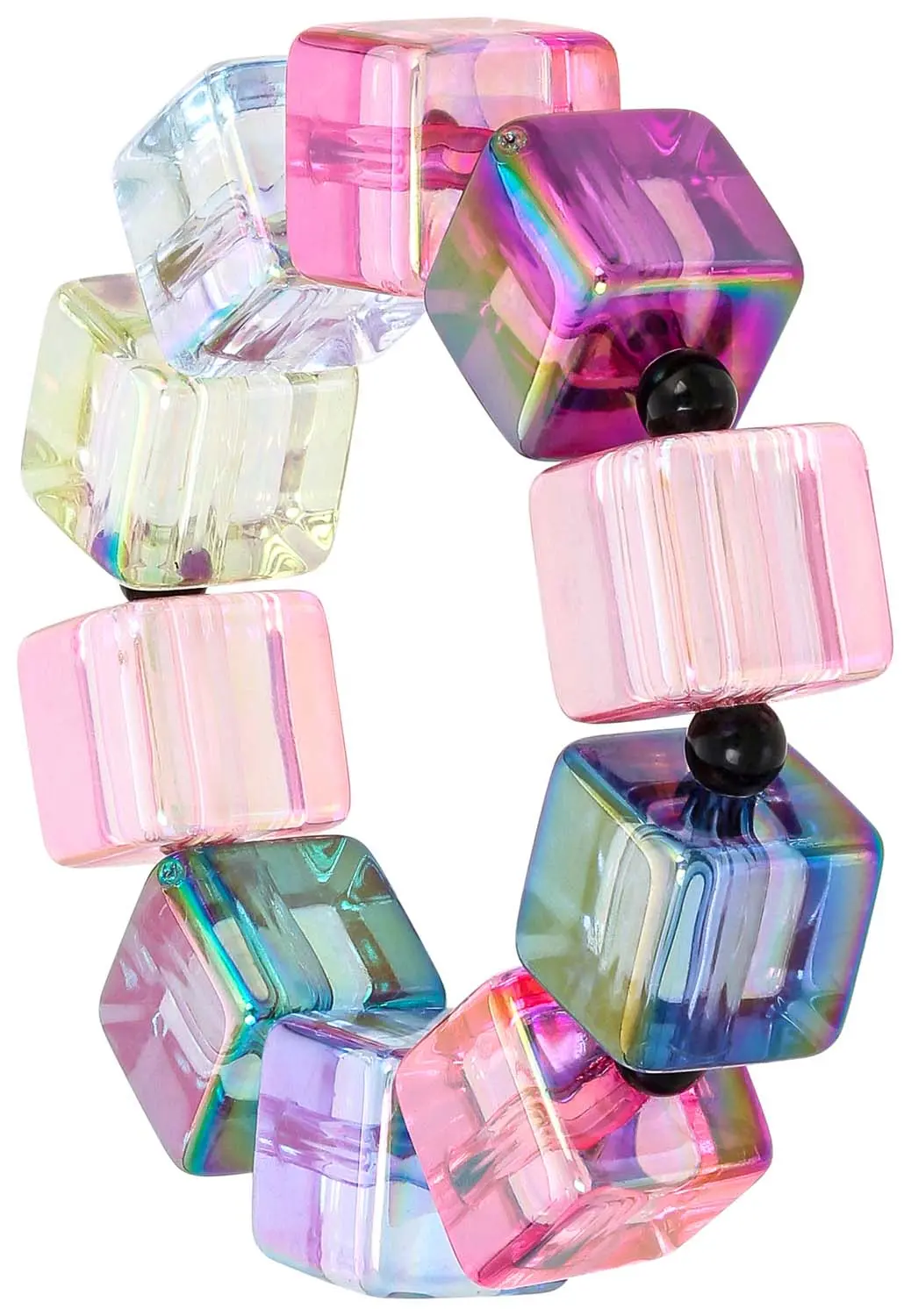 Das Armband – Statement Cubes schimmert in verschiedenen Farben und ist mit bunten WĂŒrfeln geschmĂŒckt. Das Statement-Armband zieht durch den auĂergewöhnlichen Look alle Blicke auf sich.