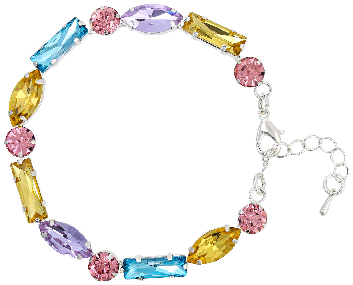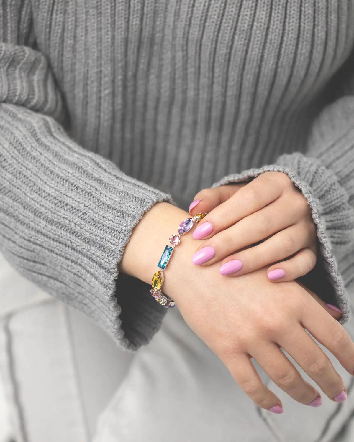 Das Armband – Sunny Spring ist silberfarben und mit Strasssteinen in unterschiedlichen Farben, Formen und Größen beschmĂĽckt. Zusätzlich ist das Armband mit einer Verlängerungskette versehen.