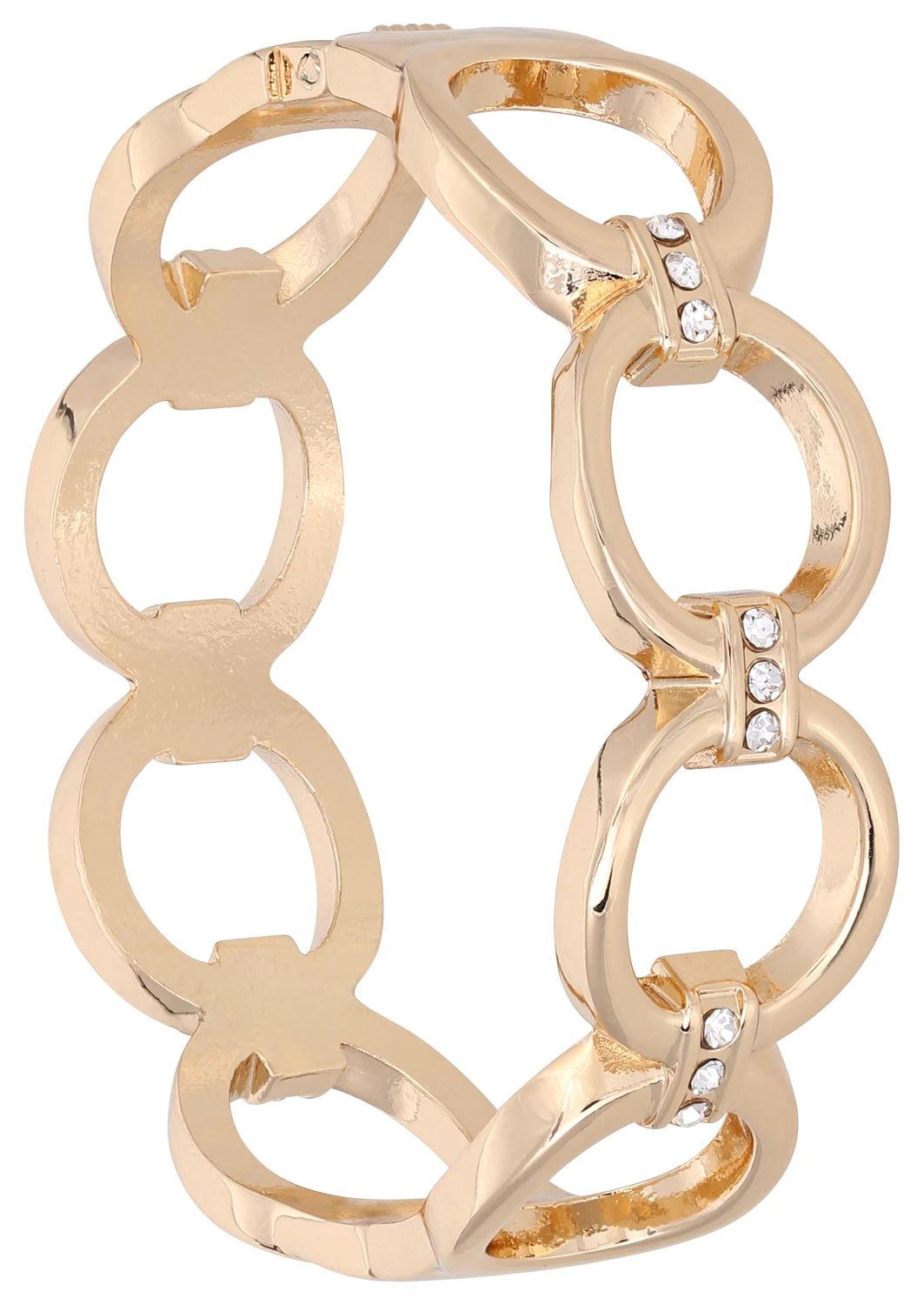 Der Armreif – Beautiful Circle in der Farbe Gold lĂ€sst sich durch ein Scharnier öffnen und ist somit aufklappbar. Kleine Strass-Steine verzieren das SchmuckstĂŒck.