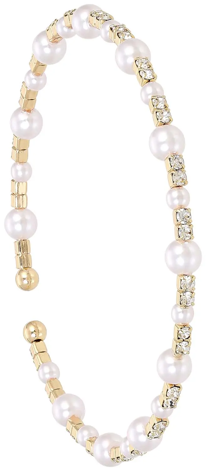 Der Armreif – Delightful Pearls schimmert goldfarben und ist abwechselnd mit Strasssteinen und Kunstperlen, in zwei verschiedenen GröĂen, beschmĂŒckt. Das Filigrane Armband ist dehnbar, sodass es jedem individuell passt.