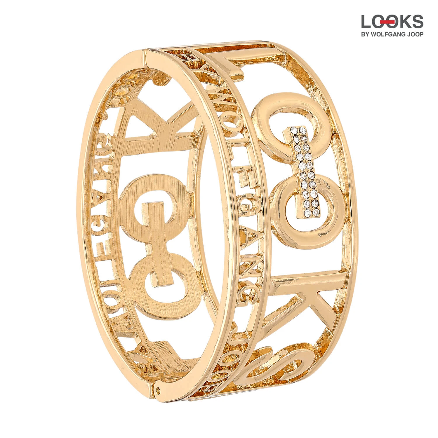 Der Armreif – Fancy Gold funkelt in goldfarben und ist mit Strasssteinen verziert. Der Armreif wird von einem groĂen „LOOKS“ Schriftzug verziert.