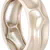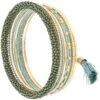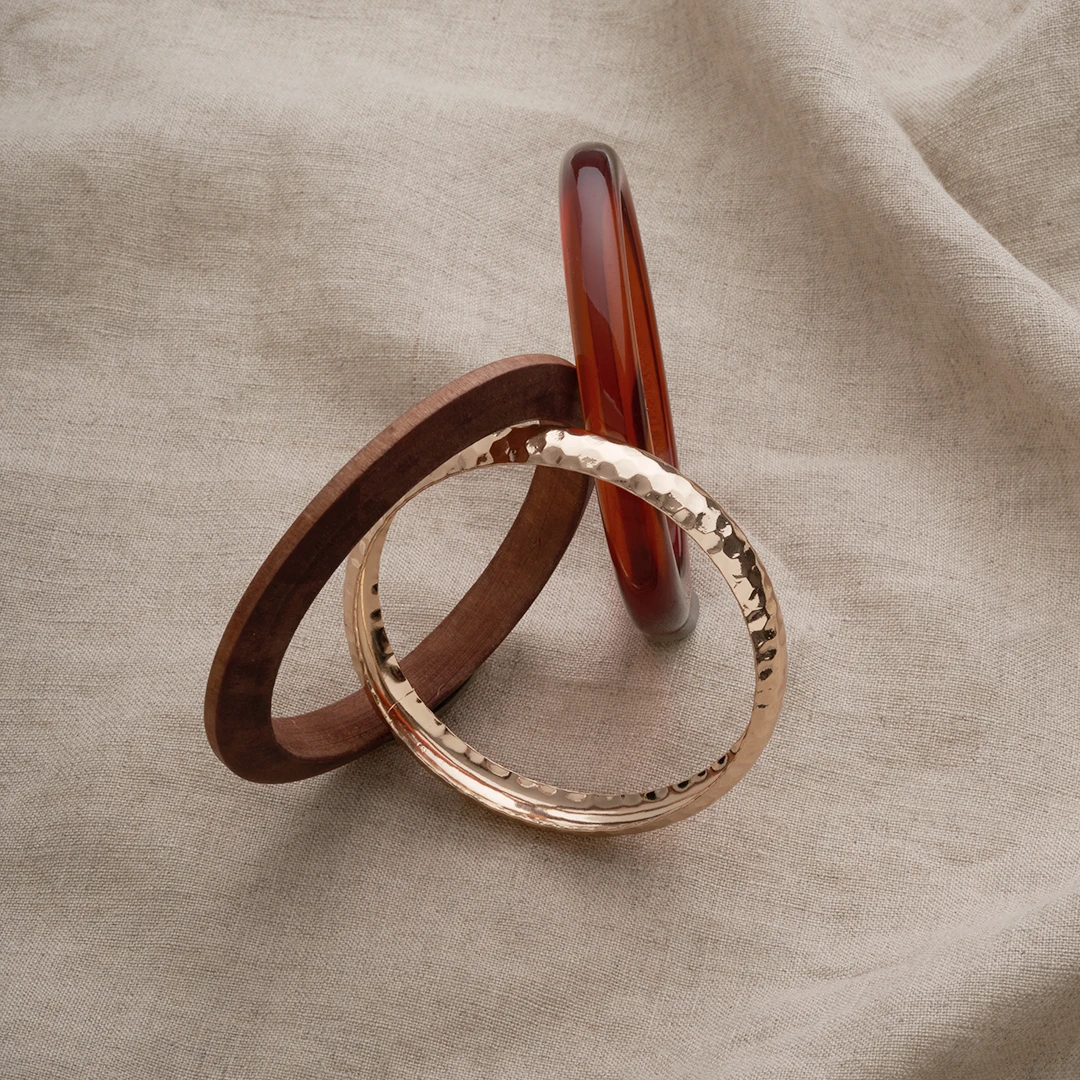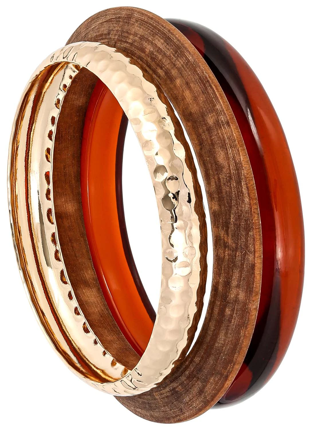 Das Armreif-Set – Crafted Look besteht aus drei Armreifen in unterschiedlichen Designs. Ein Armreif schimmert goldfarben und hat eine strukturierte Oberfläche. Ein anderer Armreif ist braun und besteht aus Holz.