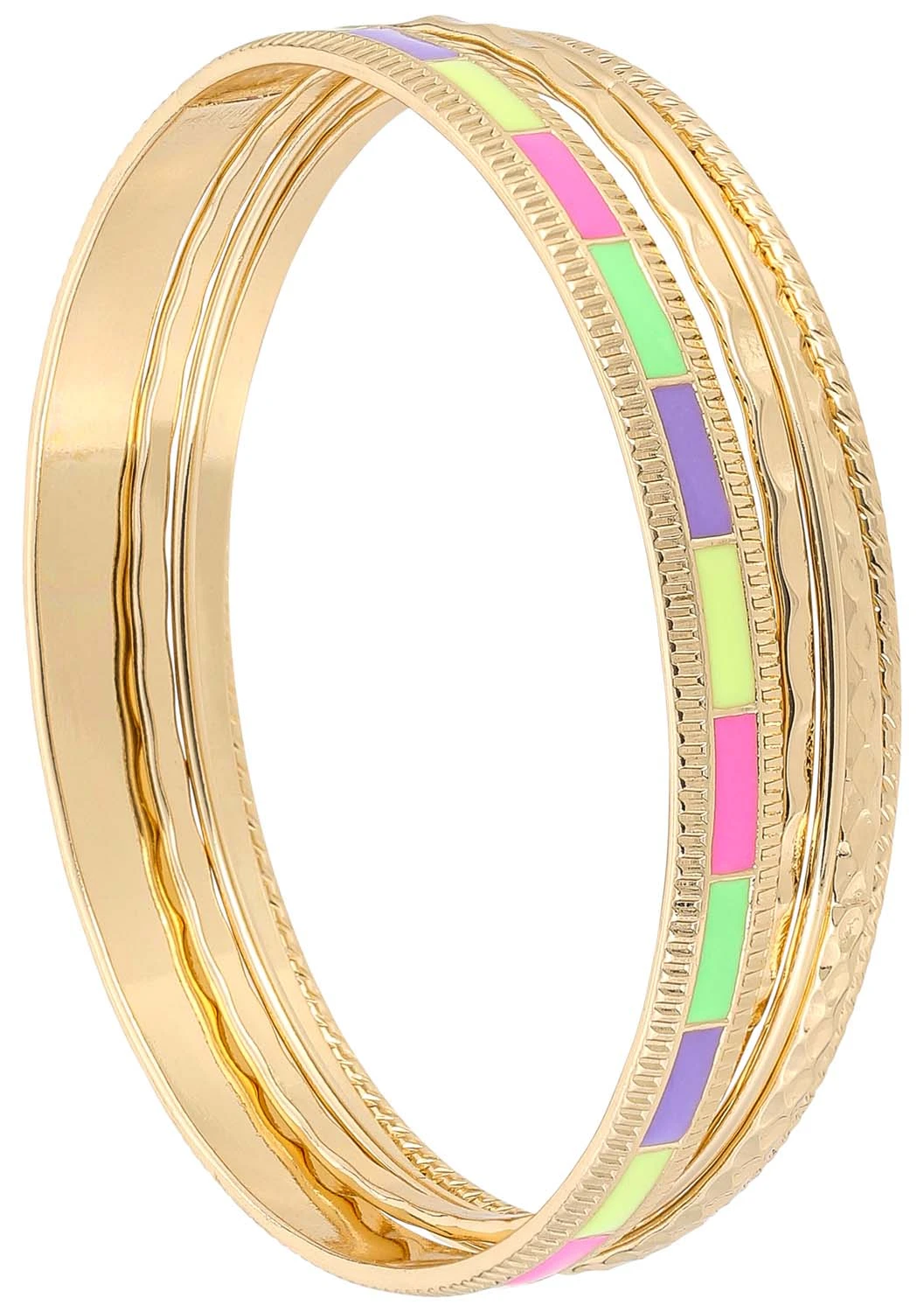 Das Armreif-Set – Golden Beauty besteht aus fĂŒnf Armreifen in unterschiedlichen Designs. Die Armreifen schimmern goldfarben und haben alle unterschiedliche OberflĂ€chen. Ein Armreif ist mit einem Muster in mehreren Farben verziert.