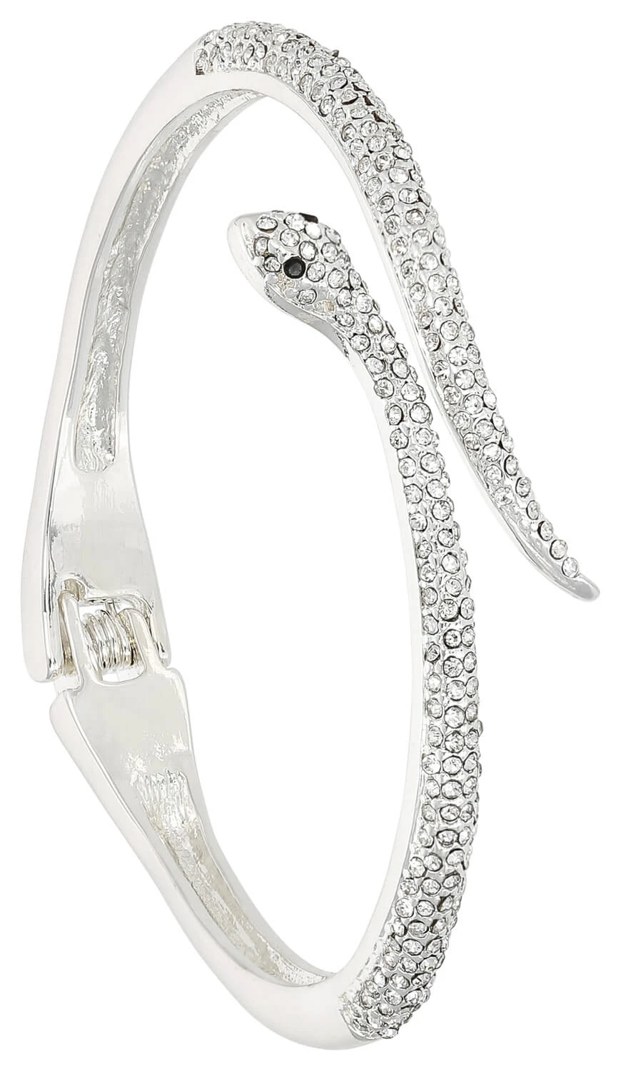 Der Armreif – Silver Snake ist silberfarben und mit vielen Strasssteinen verziert. Der Armreif hat an der Ă–ffnung einen Schlangenkopf.