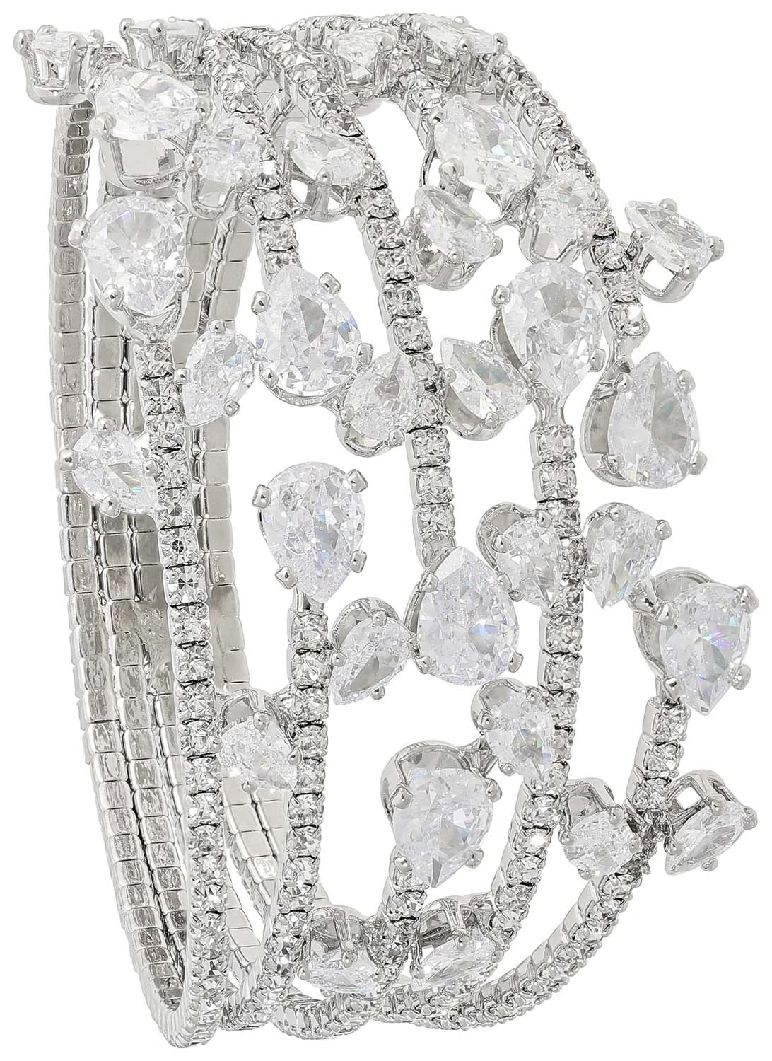 Der Armreif – Sparkling Dream schimmert silberfarben und ist rhodiniert. Der Armreif ist mit vielen Cubic Zirkonia Steinen verziert. Die groĂen Cubic Zirkonia Steine in der Mitte des Armbands haben eine Tropfenform.