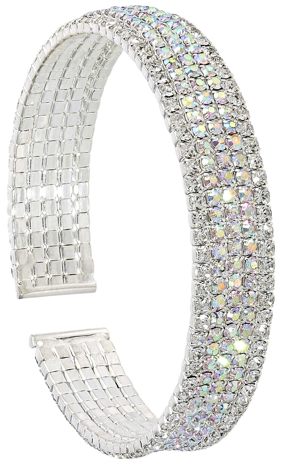 Der Armreif – Wonderful Sparkle schimmert silberfarben und ist dehnbar, sodass er sich individuell anpassen lĂ€sst. Die fĂŒnf Reihen des Armreifs sind mit funkelnden Cubic Zirkonia Steinen verziert, welche leicht mehrfarbig glĂ€nzen.