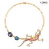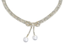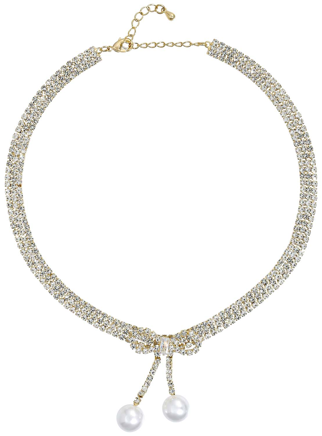 Der Choker – Brilliant Bow schimmert goldfarben und besteht aus drei zusammengehörigen Reihen. Diese sind mit vielen silberfarbenen Cubic Zirkonia Steinen besetzt. Zusätzlich schmĂĽckt eine Schleife mit zwei groĂźen Kunstperlen den Choker.