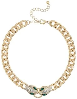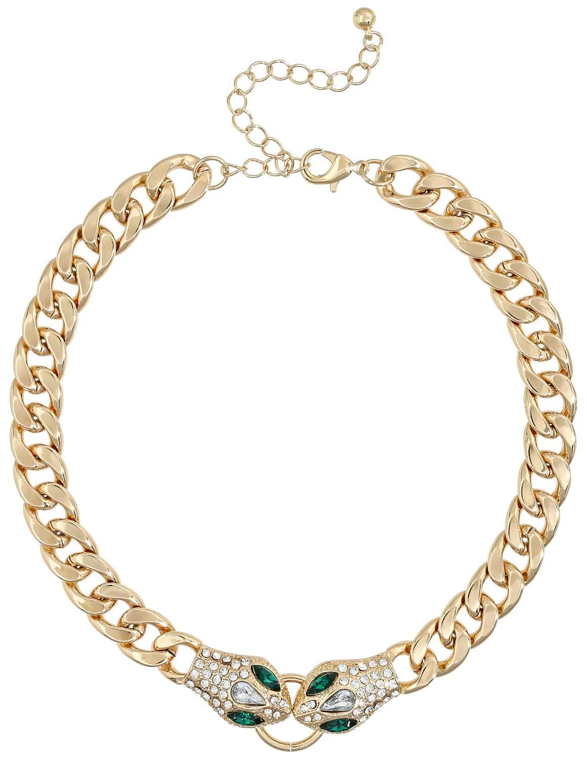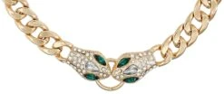 Der Choker – Golden Snake schimmert goldfarben und ist in der Form einer Gliederkette. Der Choker ist mit Strasssteinen und zwei Schlangen verziert.