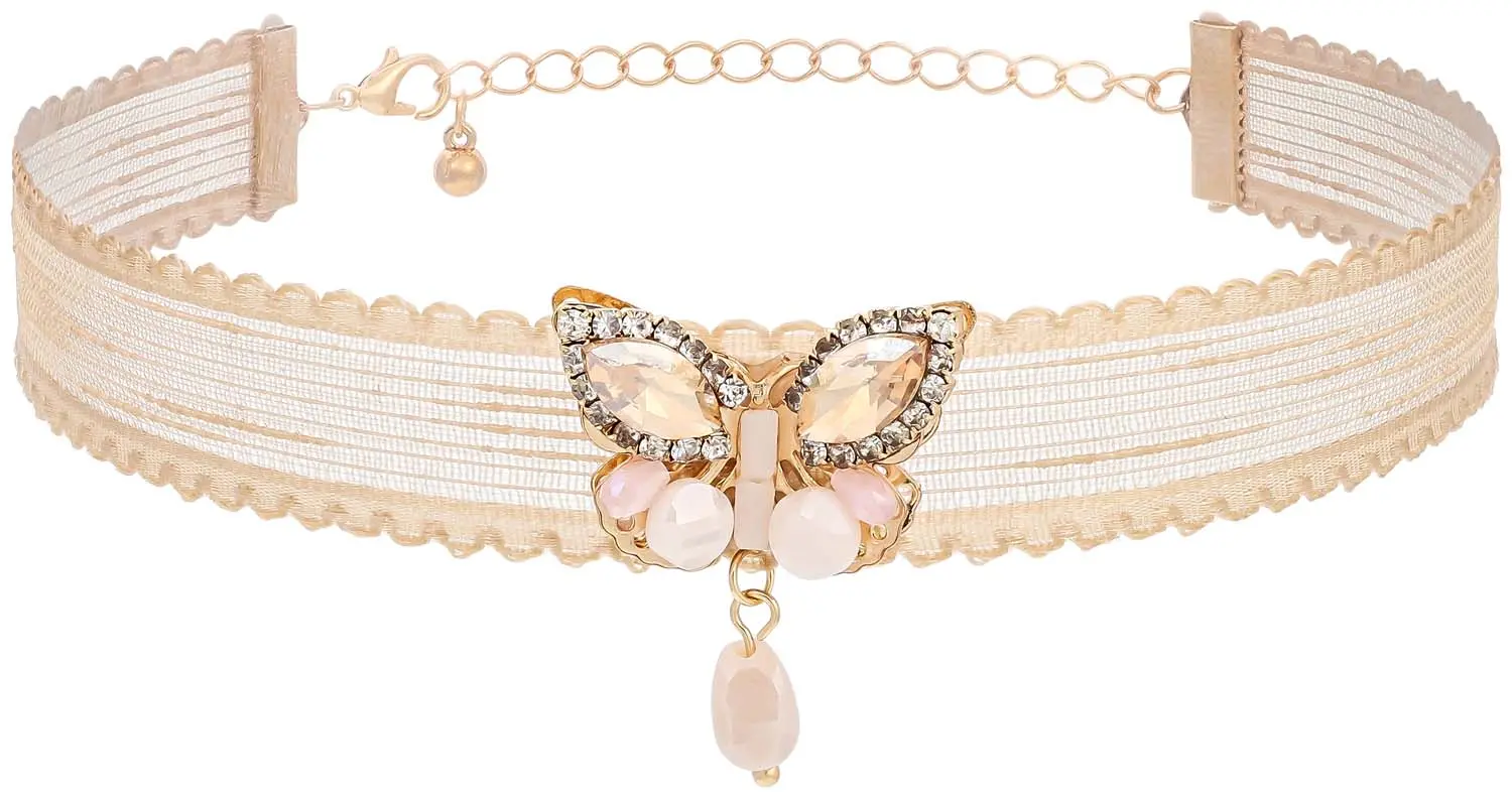 Der Choker – Ornamental Summer besteht aus einem goldfarbenen Textilband mit Spitze und hat einen AnhĂ€nger in der Mitte. Der AnhĂ€nger ist ein Ornament in Form eines Schmetterlings, welcher zusĂ€tzlich mit Strasssteinen verziert ist.