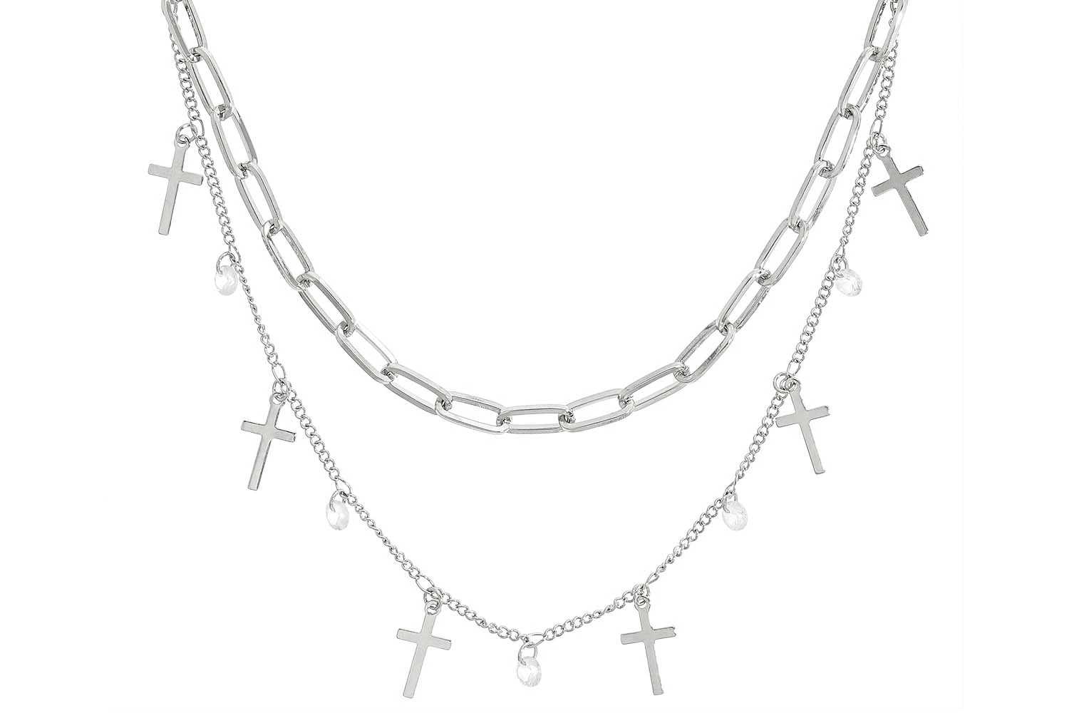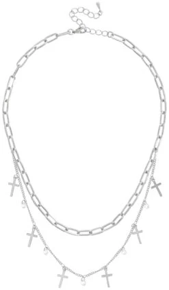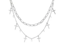 Der Choker – Small Cross schimmert silberfarben und besteht aus zwei Reihen Ketten in unterschiedlichen Designs. Die obere Reihe ist eine einfache Gliederkette und die untere Reihe ist mit Anhängern verziert. Die Anhänger sind Cubic Zirkonia Steine oder haben die Form eines Kreuzes.