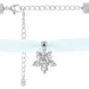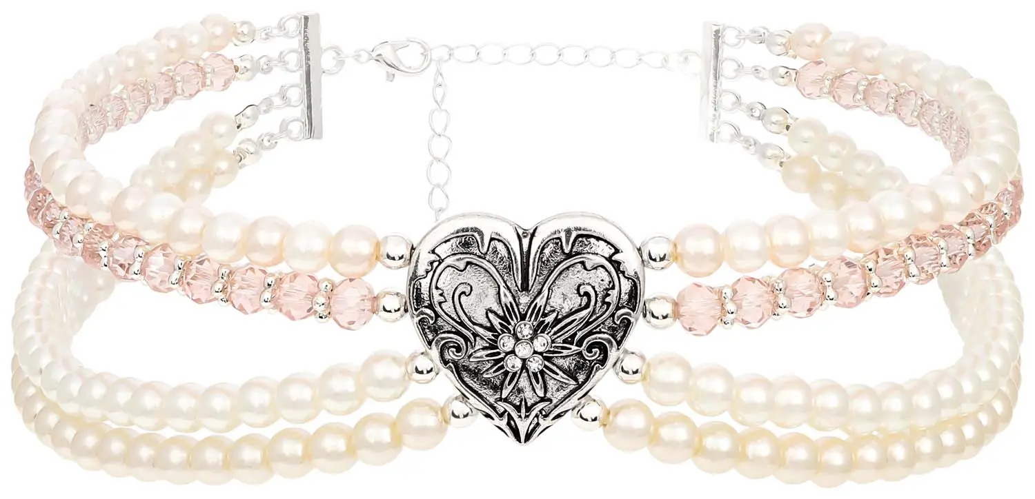 Der Choker – Soft Edelweiß besteht aus vier Reihen Ketten in ähnlichen Designs. Eine Reihe ist mit rosafarbenen Kunststoffperlen geschmückt und die anderen Reihen mit weißen Kunstperlen. Die Mitte ist mit einem Herzen und einer Edelweiß-Blume verziert.