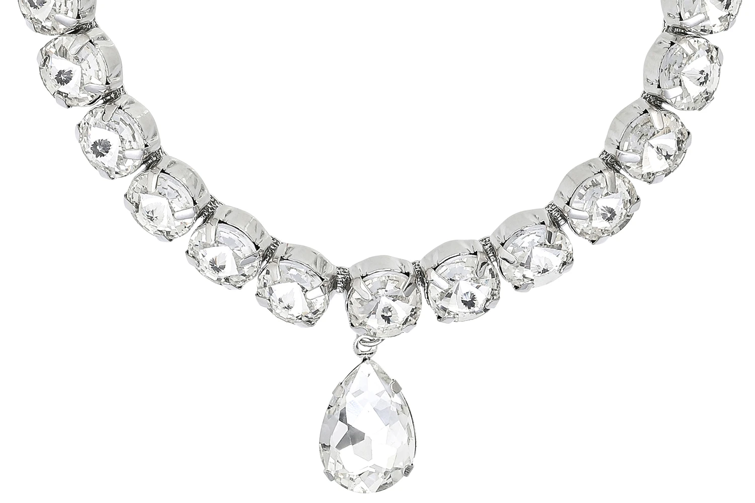 Der Choker – Sparkling Elegance schimmert silberfarben und ist rhodiniert. Der Choker ist mit vielen Strasssteinen verziert und hat einen Anhänger. Der Anhänger hat eine Tropfenform und der Choker besitzt eine Verlängerungskette. Jetzt entdecken bei Bijiou Brigitte!
