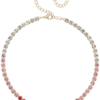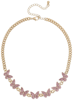 Der Choker – Sparkling Nature schimmert goldfarben und ist in der Mitte mit sieben Schmetterlingen verziert. Die Schmetterlinge sind mit rosafarbenen Strasssteinen verziert und die Kette hat eine Verlängerungskette.