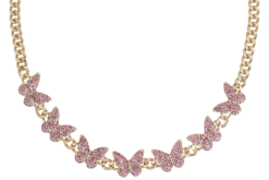 Der Choker – Sparkling Nature schimmert goldfarben und ist in der Mitte mit sieben Schmetterlingen verziert. Die Schmetterlinge sind mit rosafarbenen Strasssteinen verziert und die Kette hat eine Verlängerungskette.