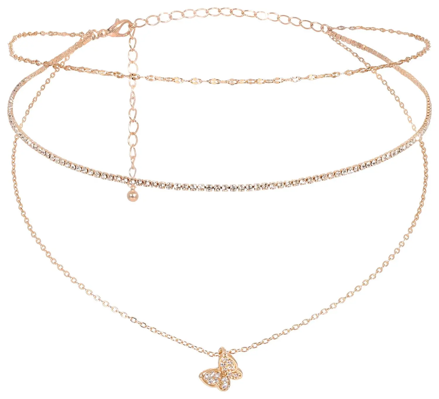 Der Choker – Sparkling Spring schimmert goldfarben und besteht aus drei Reihen Ketten in unterschiedlichen Designs. Die untere Reihe hat einen Schmetterlings-AnhĂ€nger, der mit funkelnden Cubic Zirkonia Steinen verziert ist.