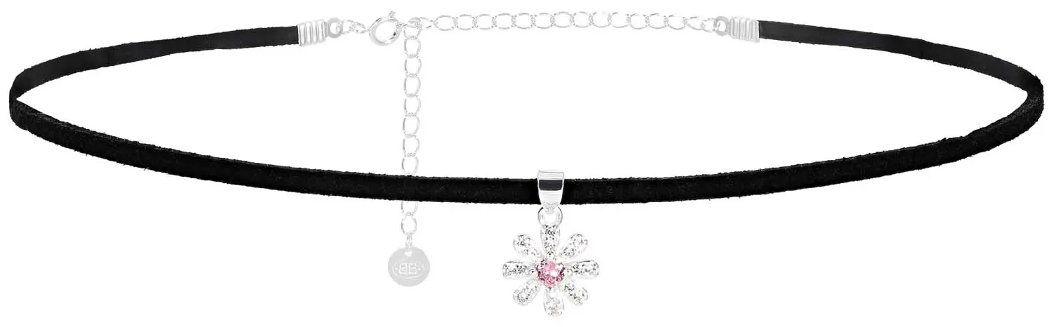 Der Choker – Velvet Flower besteht aus einem schwarzen Samtband und hat einen AnhĂ€nger in der Mitte. Der AnhĂ€nger ist in Form einer Blume und bestehts aus 925er Echtsilber. ZusĂ€tzlich ist der AnhĂ€nger mit silberfarbenen und einem rosafarbenen Cubic Zirkonia Stein verziert. Der Verschluss, sowie die VerlĂ€ngerungskette bestehen ebenfalls aus 925er Echtsilber.