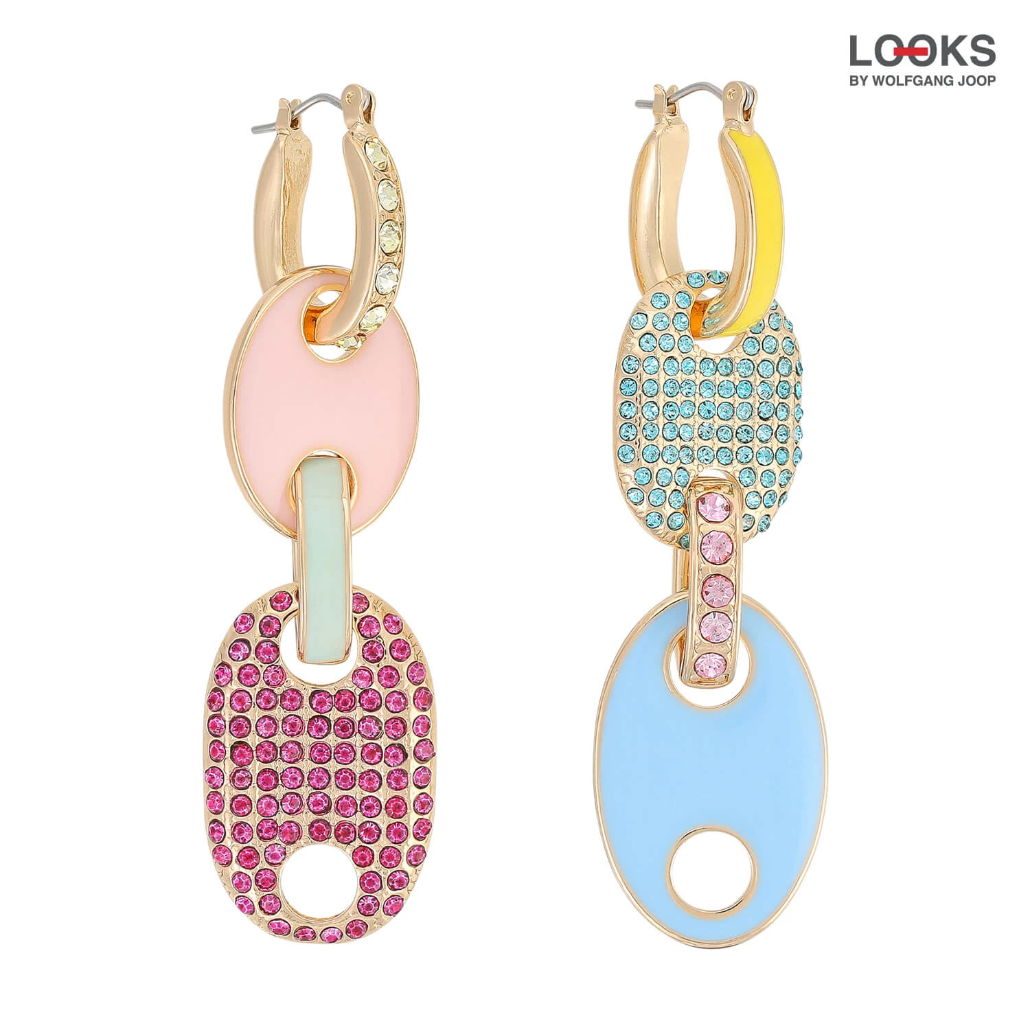 Die Creolen – Chunky Glitter funkeln in mehreren Farben und sind mit Strasssteinen verziert. Die Creolen sind mit AnhĂ€ngern in der Optik einer Gliederkette verziert.