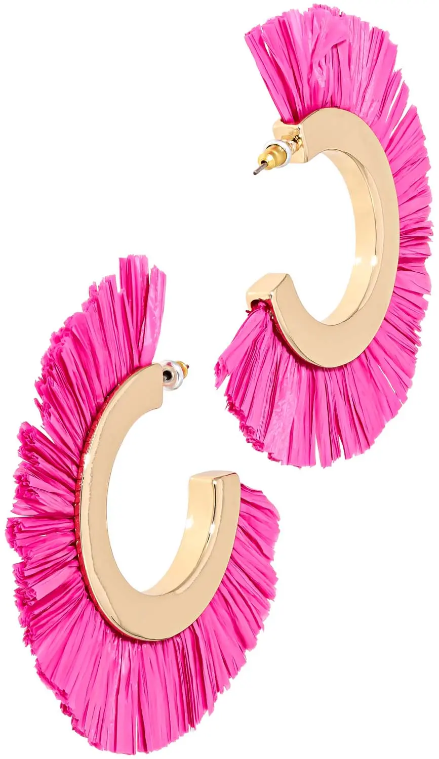 Die Creolen – Fancy Fuchsia schimmern goldfarben und sind an der AuĂenseite mit Papierstroh in Fuchsia-Farbe beschmĂŒckt. Die Creolen sind wahre Statement Ohrringe und sind ein Hingucker schlechthin.