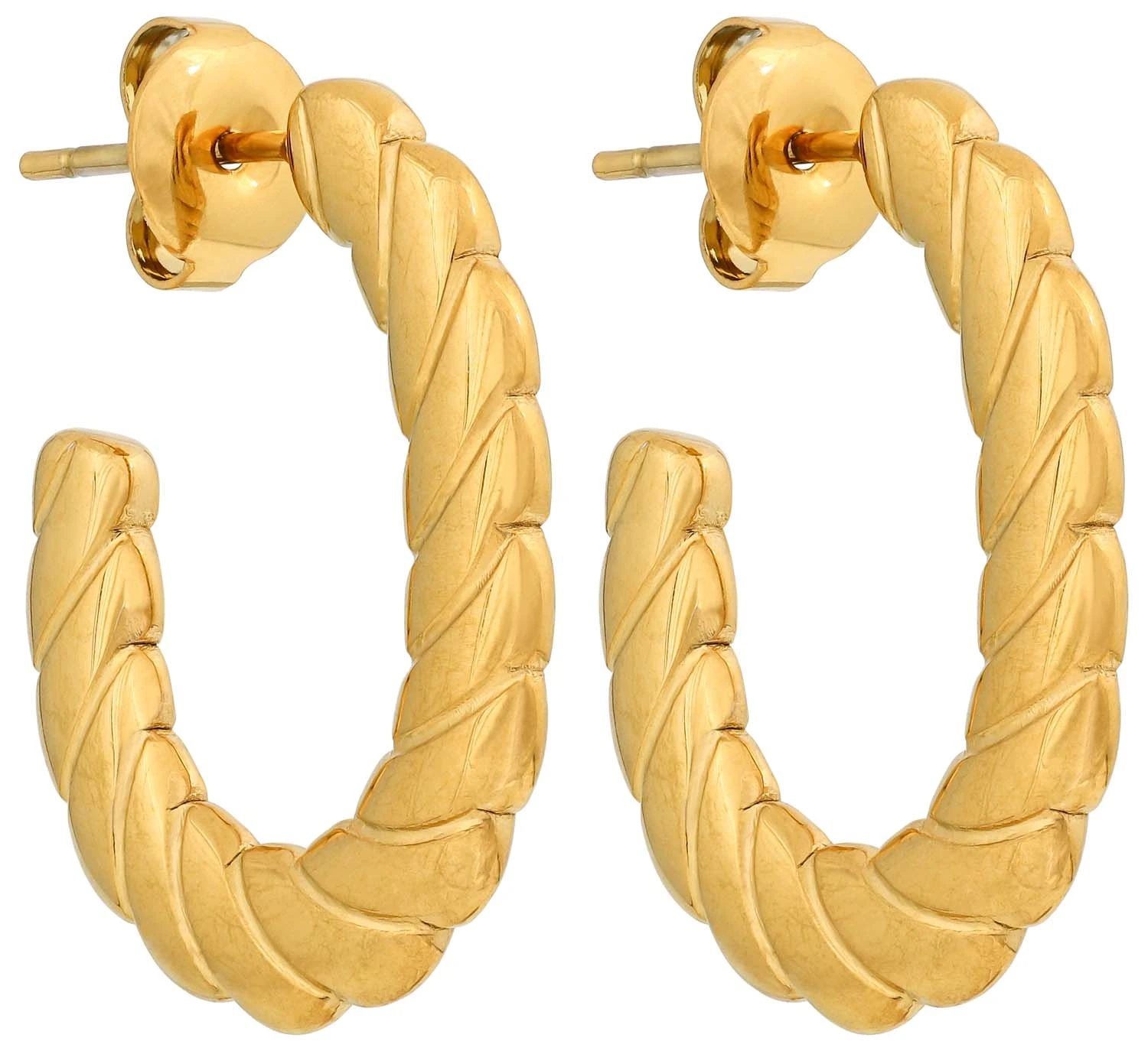 Die Creolen – Golden Twirl schimmern goldfarben und bestehen aus Edelstahl. Die Creolen haben eine strukturierte OberflĂ€che und sind das perfekte Basic. Durch ihren klassischen Look lassen sich die Creolen zu jedem Look kombinieren.