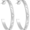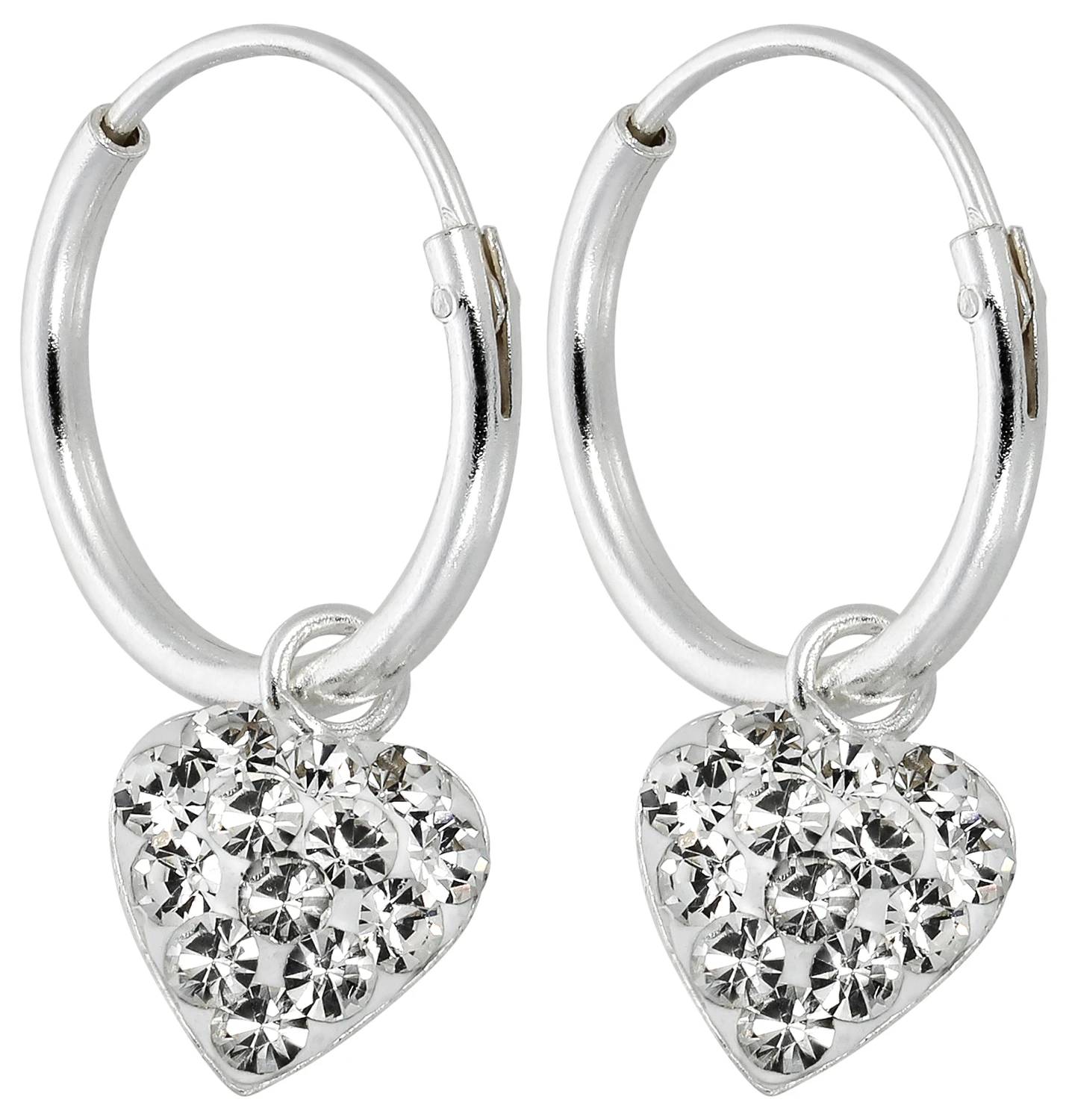 Silberne Ohrring mit kleinen sĂŒĂen Herz AnhĂ€ngern. Diese sind verziert mit Glaskristallen.
