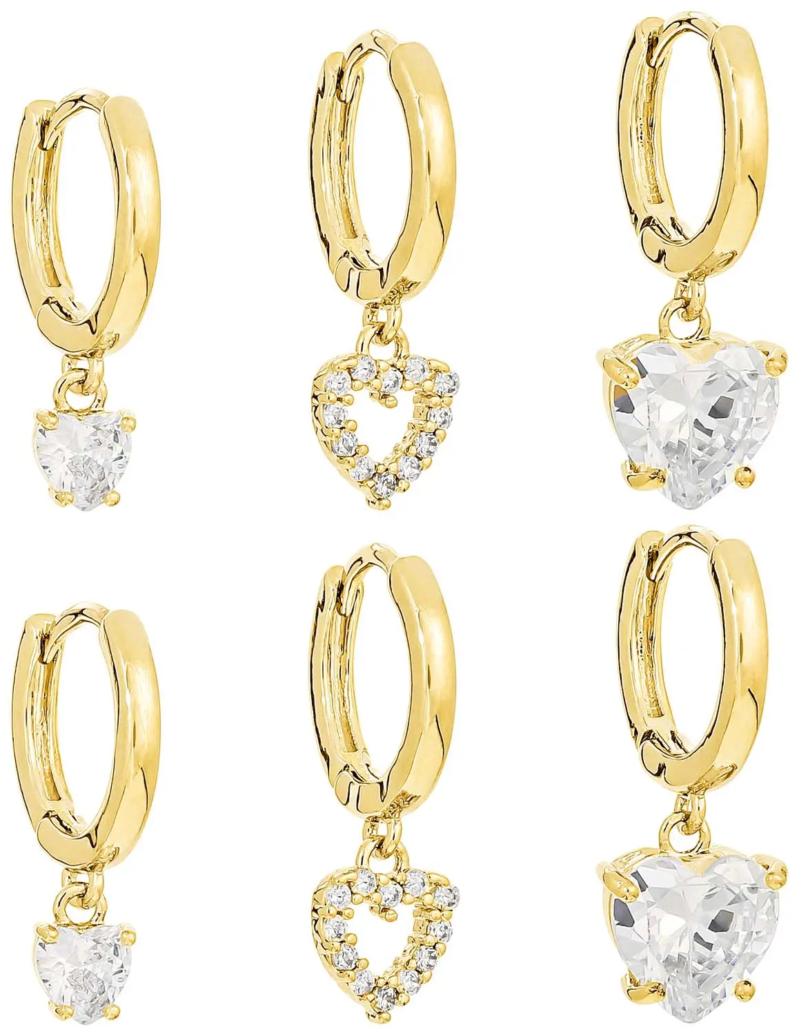 Das Creolen-Set – Sparkling Hearts schimmert goldfarben und besteht aus drei Paar Creolen in Ă€hnlichen Designs. Alle Creolen haben einen AnhĂ€nger in der Form eines Herzens, die mit Cubic Zirkonia Steinen in verschiedenen GröĂen verziert sind.