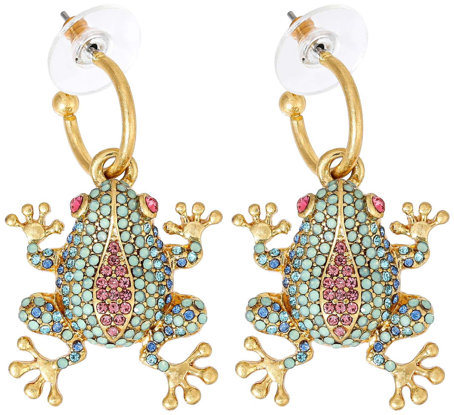 Die Creolen – Sparkling Pond schimmern goldfarben und haben jeweils einen AnhĂ€nger in der Form eines Forsches. Der Frosch ist mit kleinen Strasssteinen in vielen verschiedenen Farben verziert.