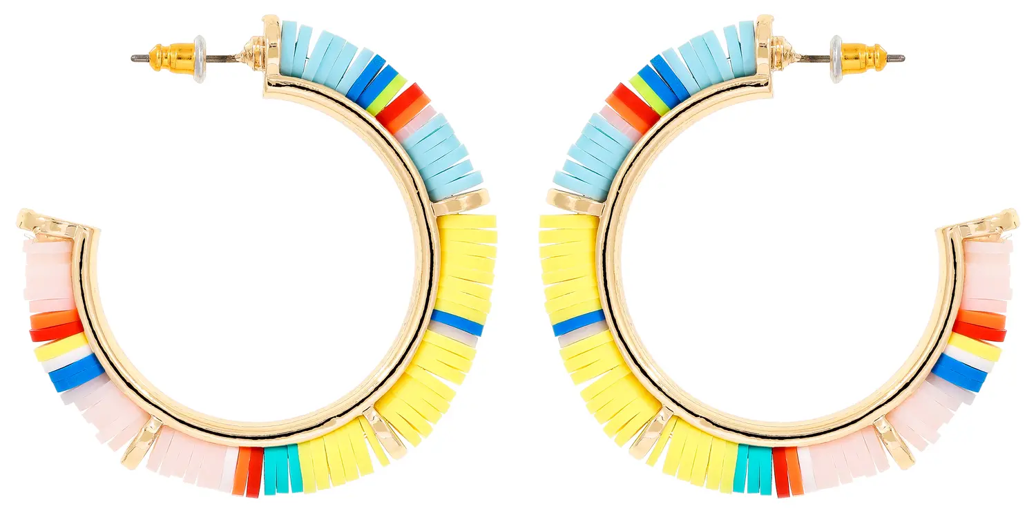 Die Creolen – Vacation Mode glĂ€nzen goldfarben und sind mit scheibenförmigen Perlen in den Farben blau, gelb und rosa verziert.
