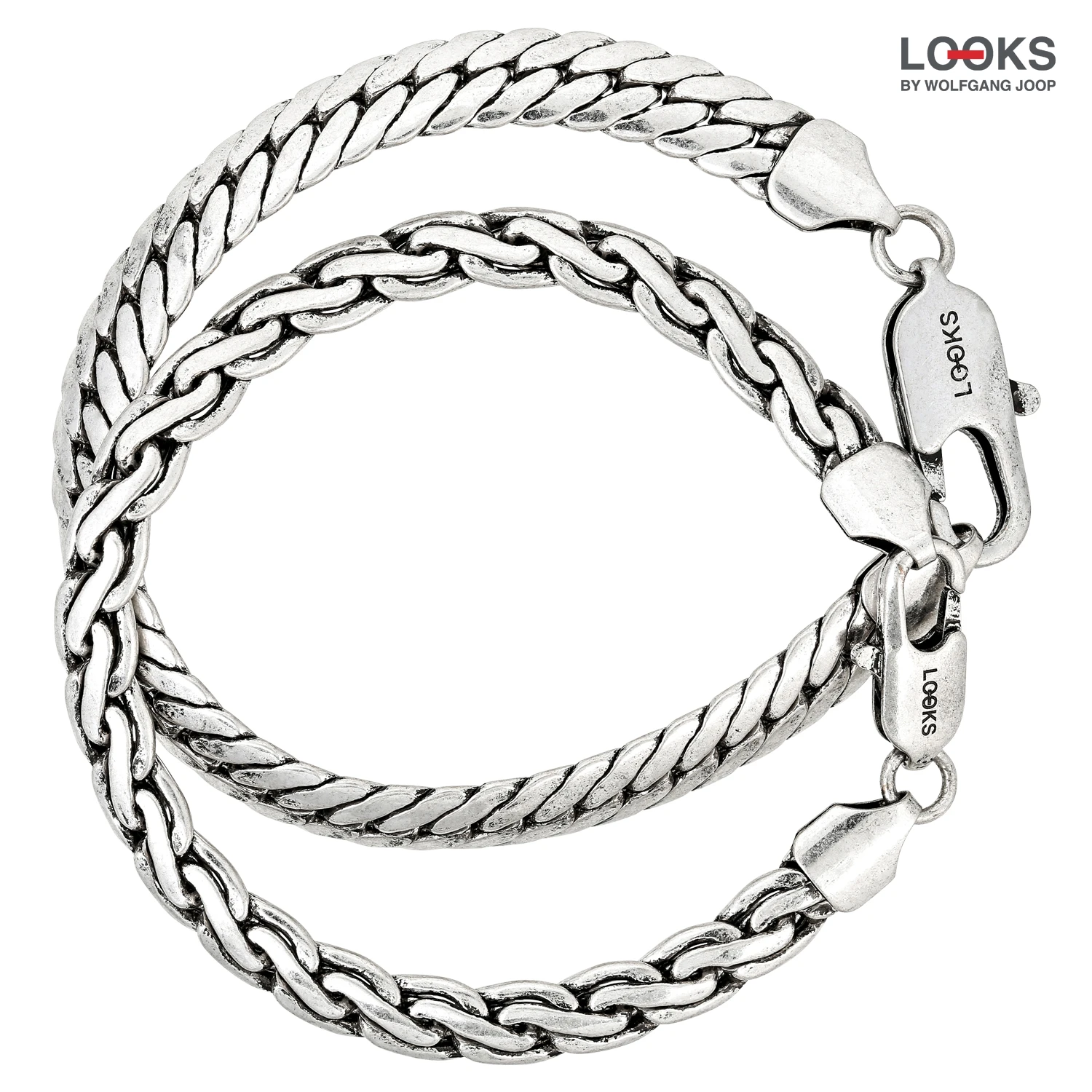 Das Herren Arm-Set – Strong Together in der Farbe Silber besteht aus zwei ArmbĂ€ndern. Beide ArmbĂ€nder bestehen aus Schlangenketten.