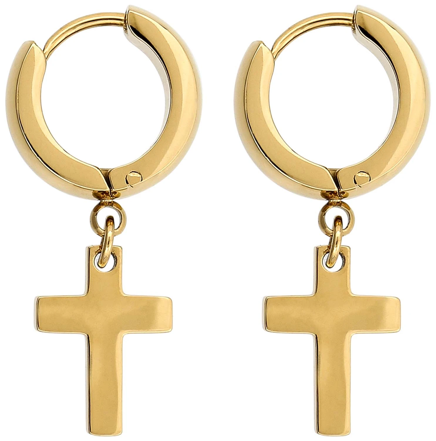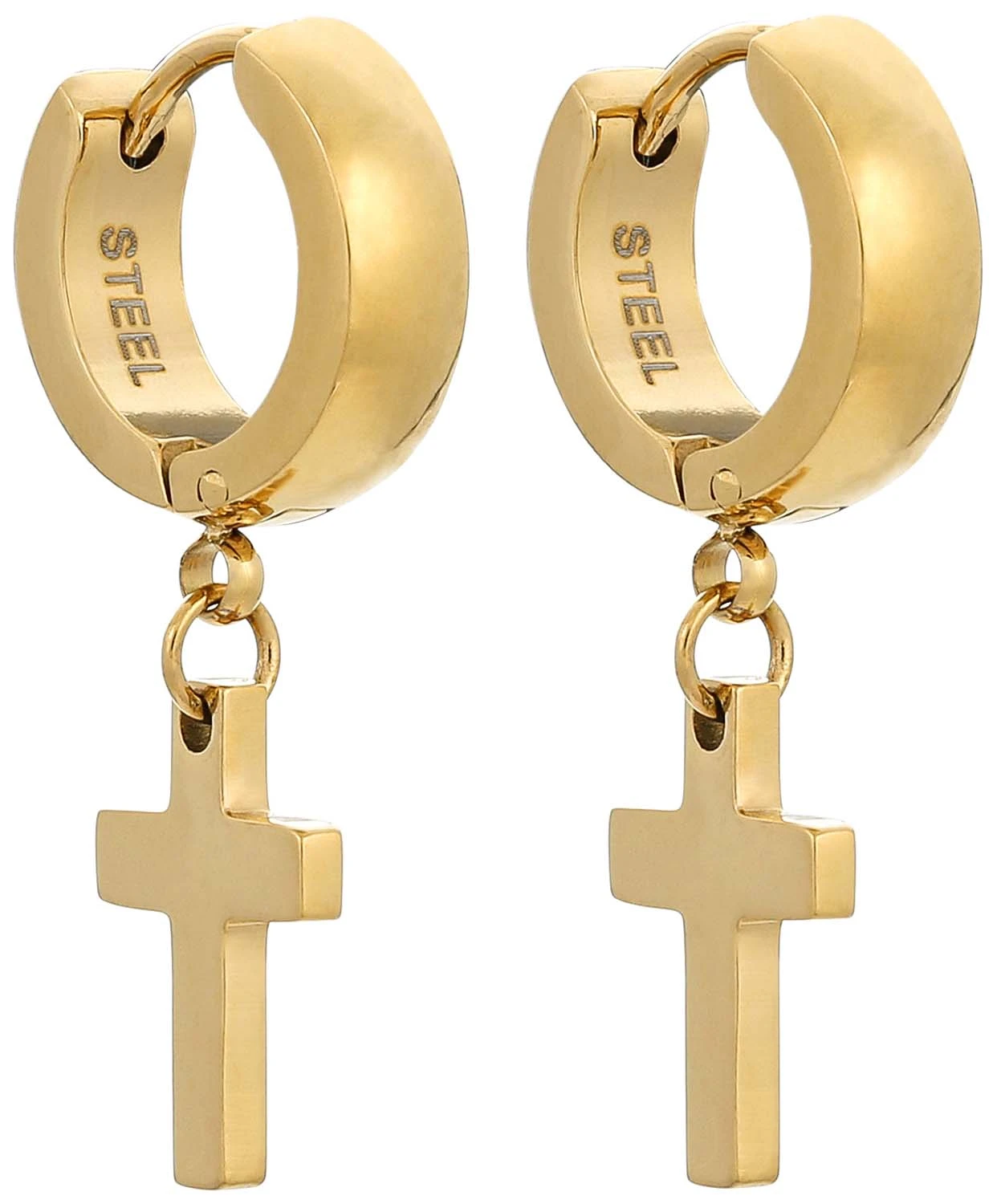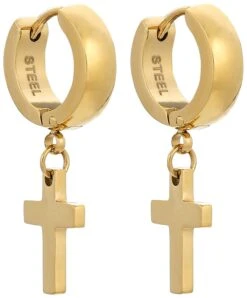 Die Herren Creolen – Gold Cross sind kleine goldfarbene Creolen aus Edelstahl mit Kreuz-Anhängern.