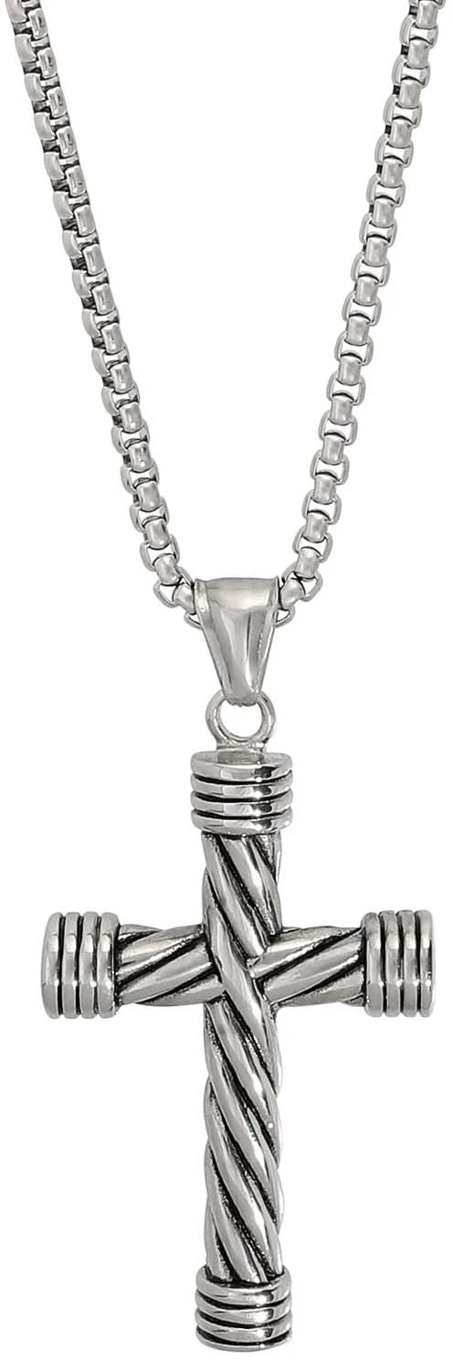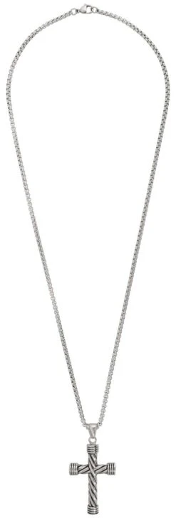 Die Herren Kette – Silver Cross ist eine silberfarbene Venezianerkette mit einem groĂźen Kreuzanhänger. Das Kreuz hat eine gedrehte Optik und ist an den Enden mit kleinen Ringen beschmĂĽckt. Die Kette besteht aus Edelstahl.