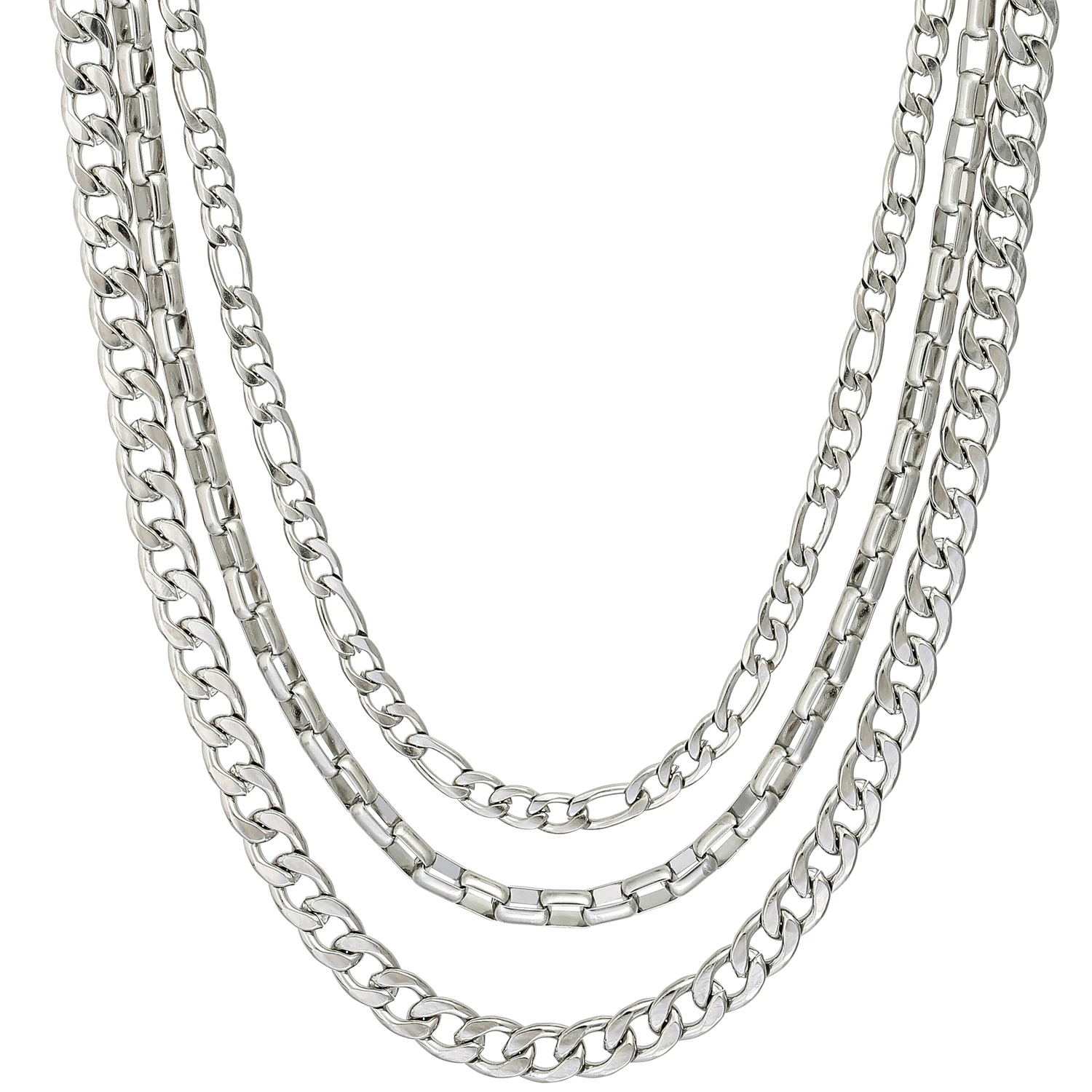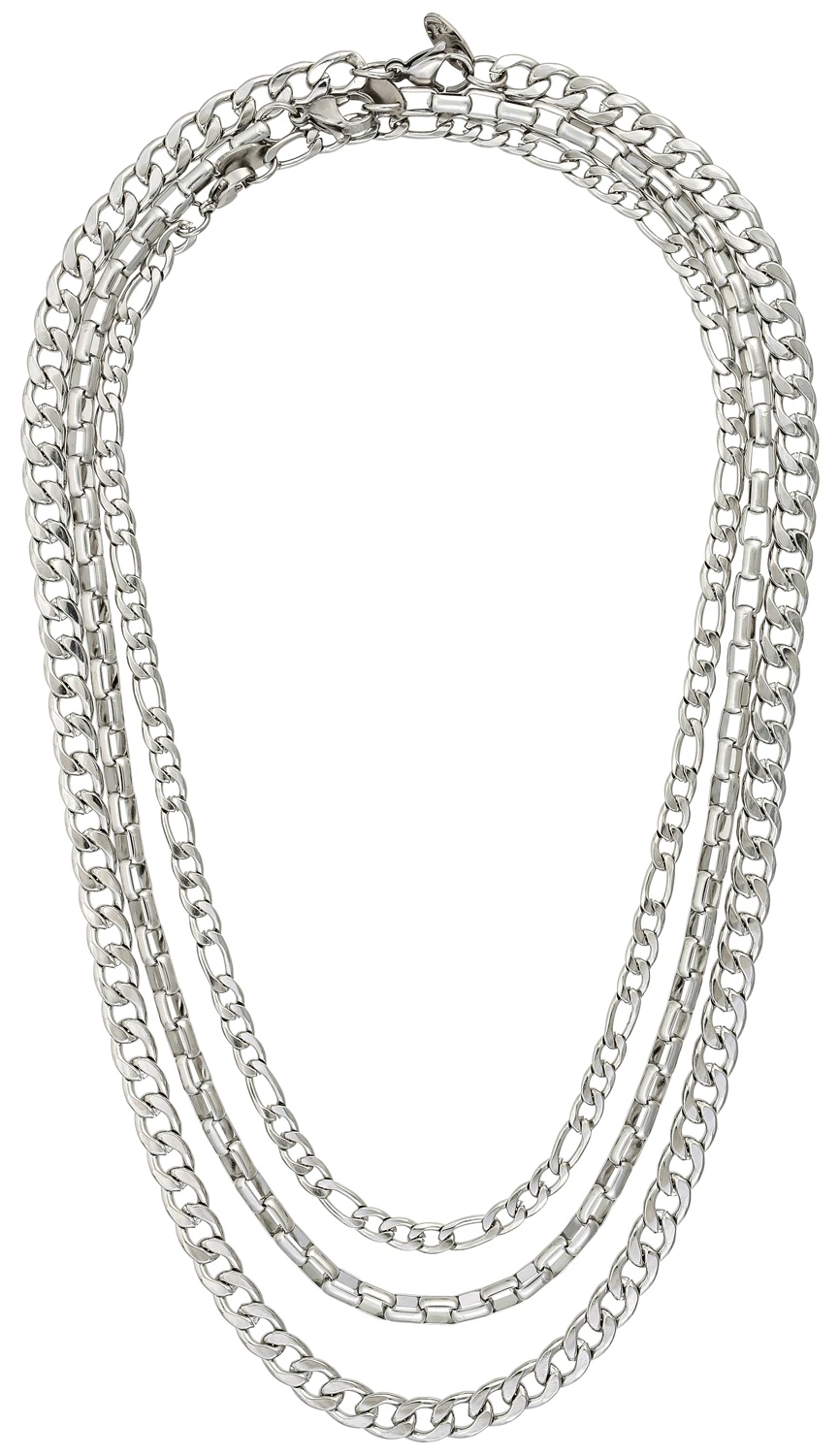 Das Herren Ketten-Set – Layering Truth bestehend aus Edelstahl und in der Farbe Silber, besteht aus 3 modischen Ketten, die sich prima im Layering tragen lassen.