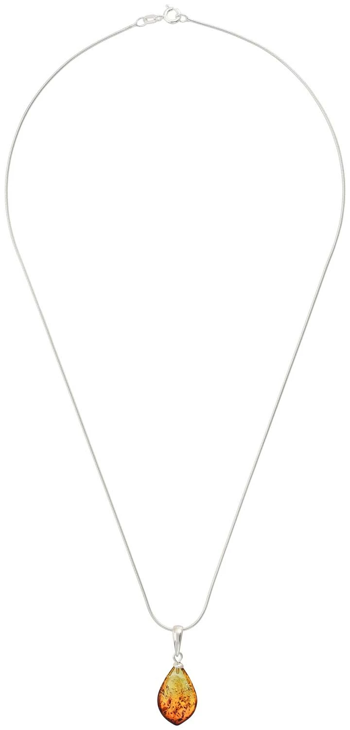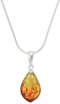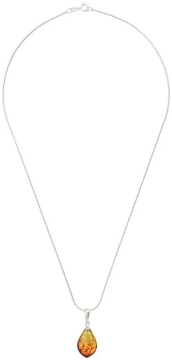 Die Kette – Amber Drop funkelt in silberfarben und besteht aus 925er Echtsilber. Die Kette ist mit einem tropfenförmigen Anhänger aus Bernstein verziert.