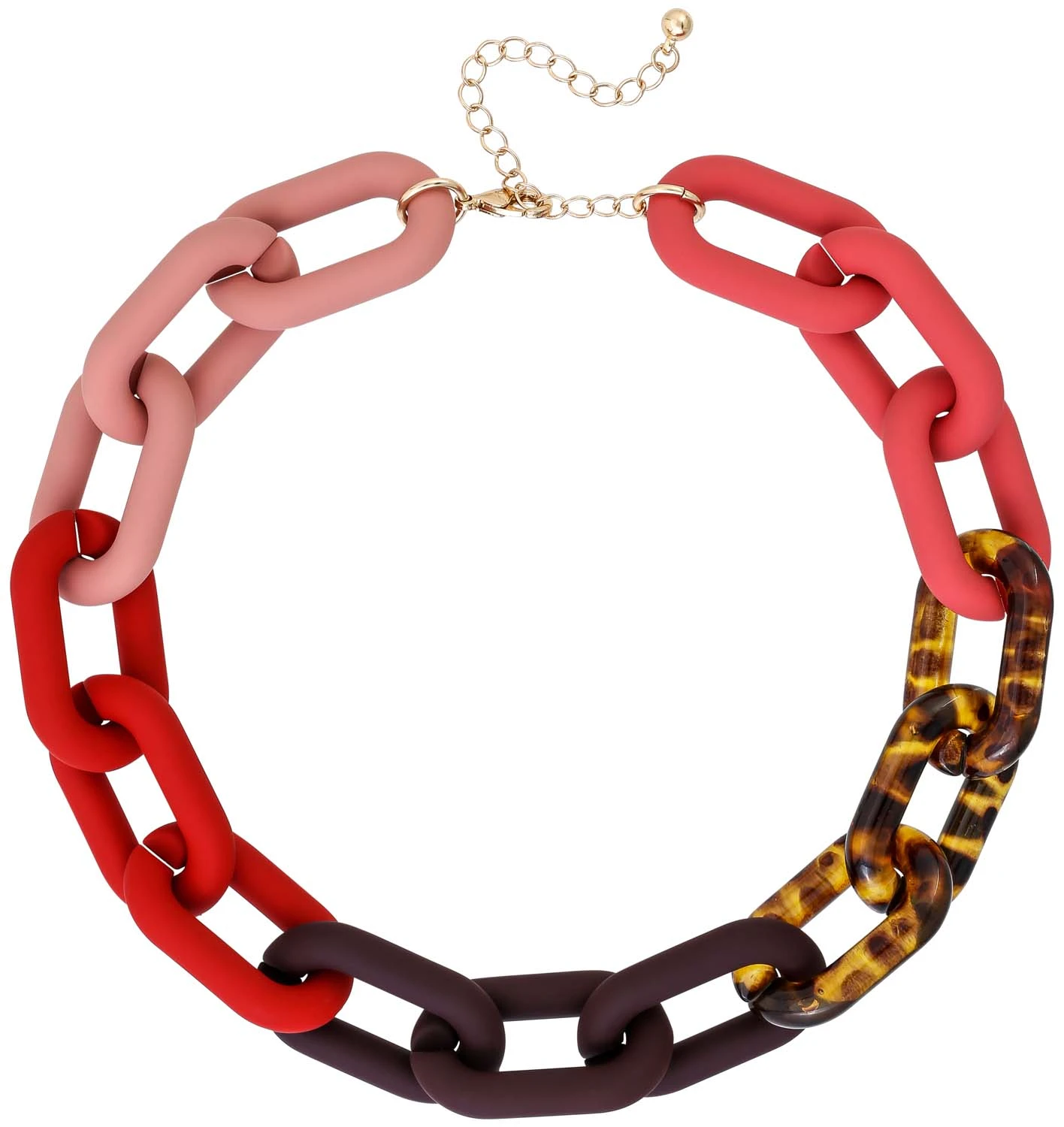 Die Kette – Colorful Leo ist mehrfarbig in verschiedenen Rot-Tönen. Die Kette ist eine richtige Statement Kette und ist teilweise mit einem Leoparden-Muster verziert. Die Kette ist eine Gliederkette und besitzt eine VerlĂ€ngerungskette.