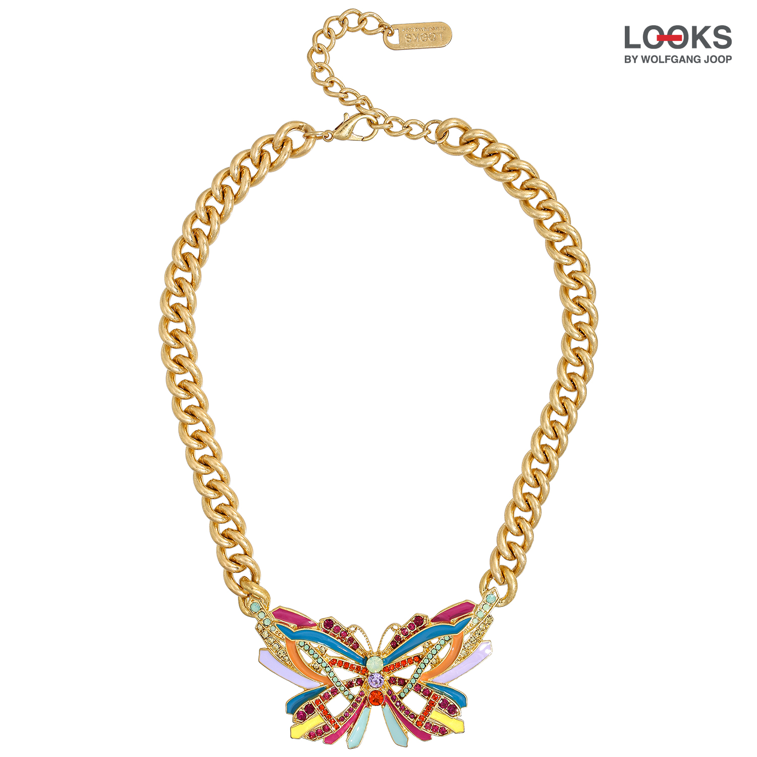 Die Kette – Colorful Summer ist eine goldfarbene Statement Kette, welche mit einem Schmetterlingsanhänger beschmĂĽckt ist. Der Schmetterling hat ein farbenfrohes Design und ist zusätzlich mit bunten Strasssteinen verziert. Die Kette ist aus der LOOKS by Wolfgang Joop Kollektion.
