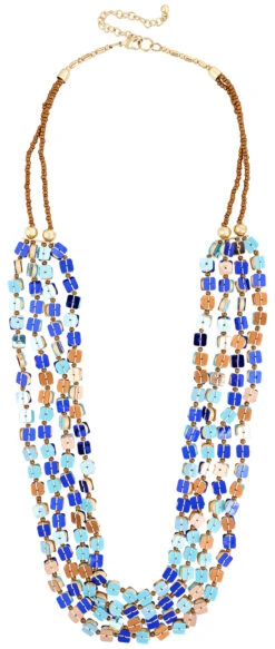 Die Kette – Glamour Blue besteht aus kleinen Holzelementen, die mit Pailletten in den Farben Blau und TĂĽrkis besetzt sind, sie hat eine Verlängerungskette.