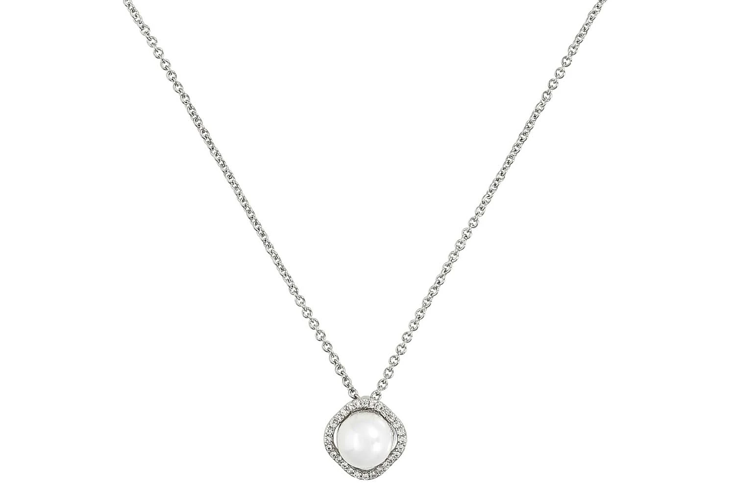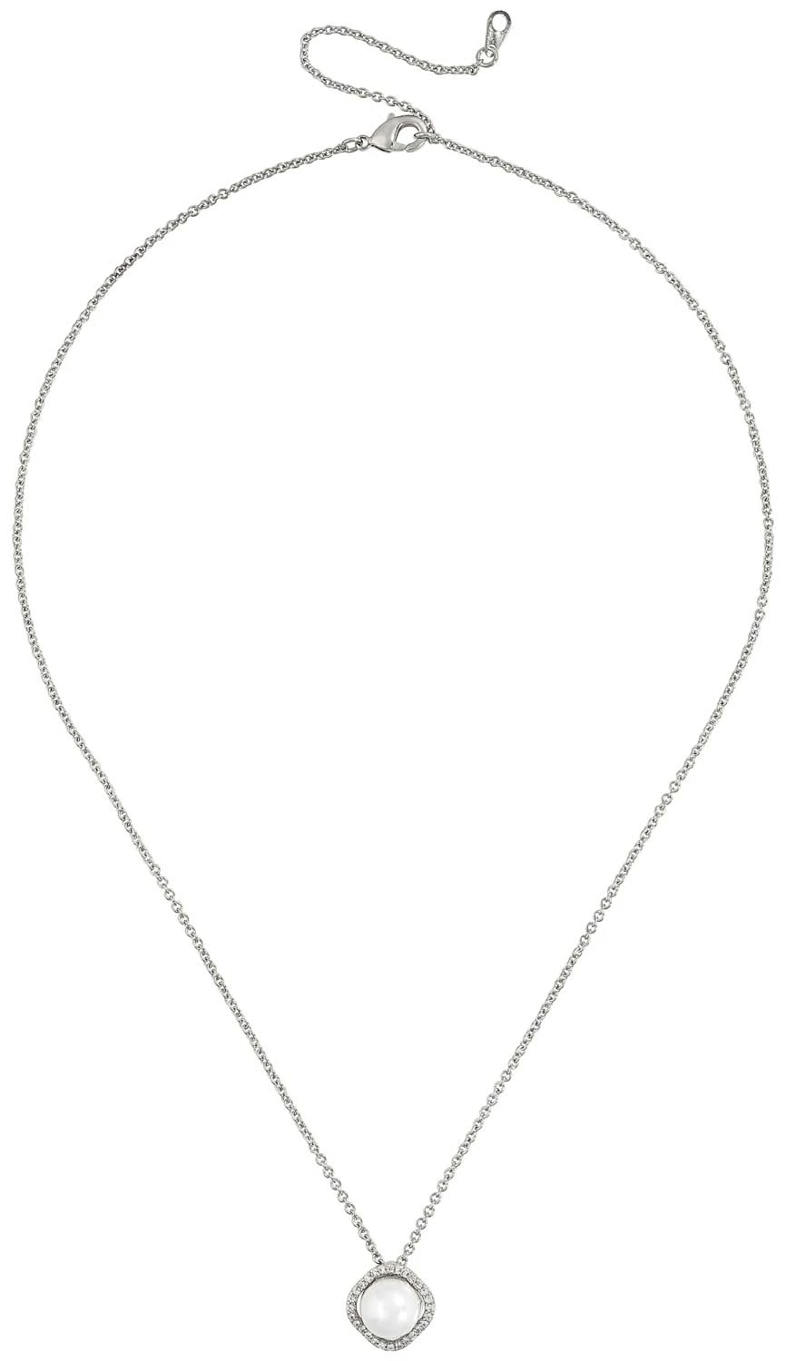 Die Kette – Glitter Pearl schimmert in silberfarben und ist rhodiniert. Die Kette hat einen Anhänger mit einer Perle. Der Anhänger ist mit Cubic Zirkonia Steinen verziert.