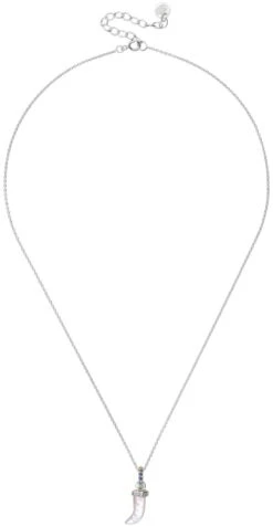 Die Kette – Glitter Tooth hat einen Anhänger in der Form eines Zahns und schimmert silberfarben. Die Kette besteht aus 925er Echtsilber und ist eine Gliederkette. Der Anhänger besteht aus Perlmutt und ist mit Cubic Zirkonia Steinen in verschiedenen Farben verziert.