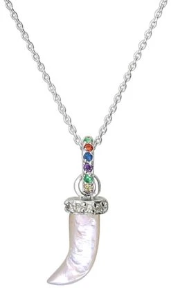 Die Kette – Glitter Tooth hat einen Anhänger in der Form eines Zahns und schimmert silberfarben. Die Kette besteht aus 925er Echtsilber und ist eine Gliederkette. Der Anhänger besteht aus Perlmutt und ist mit Cubic Zirkonia Steinen in verschiedenen Farben verziert.