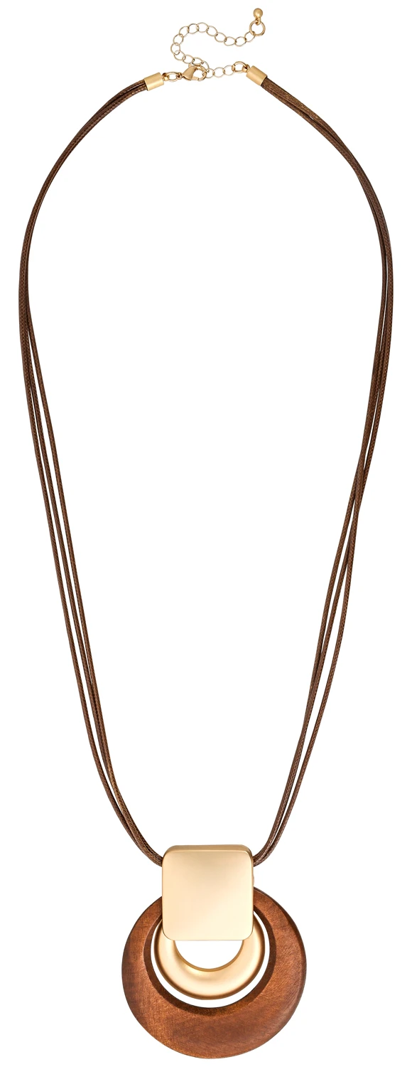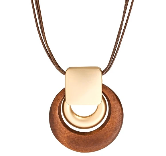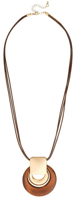 Die Kette – Golden Brightness besteht aus einem mehrreihigem Textilband und hat einen runden Anhänger bestehend aus Holz.