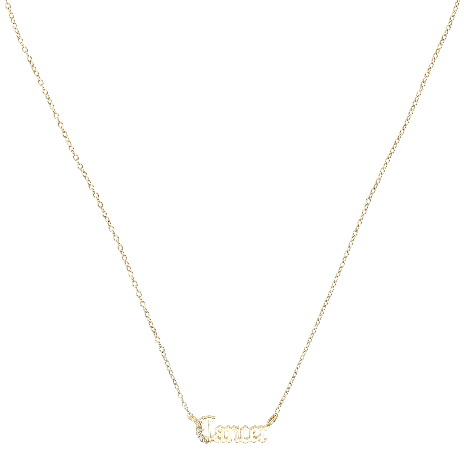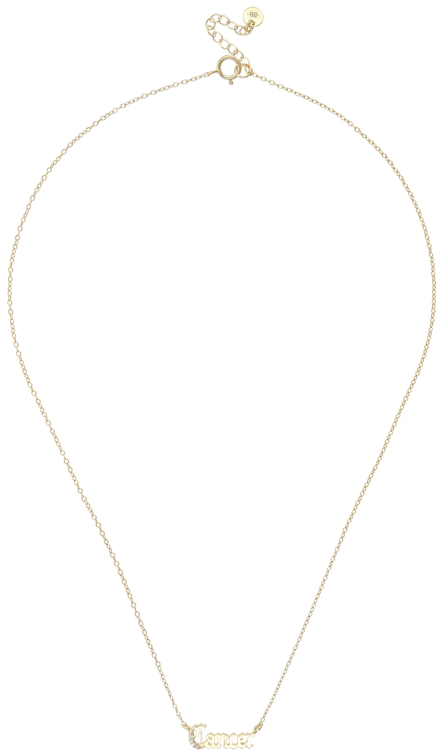 Die Kette – Golden Cancer strahlt in Gold und besteht aus 925er Silber. Sie besitzt einen Anhänger mit dem Schriftzug „Cancer“, bei dem der erste Buchstabe mit Cubic Zirkonia Steinen verziert ist.